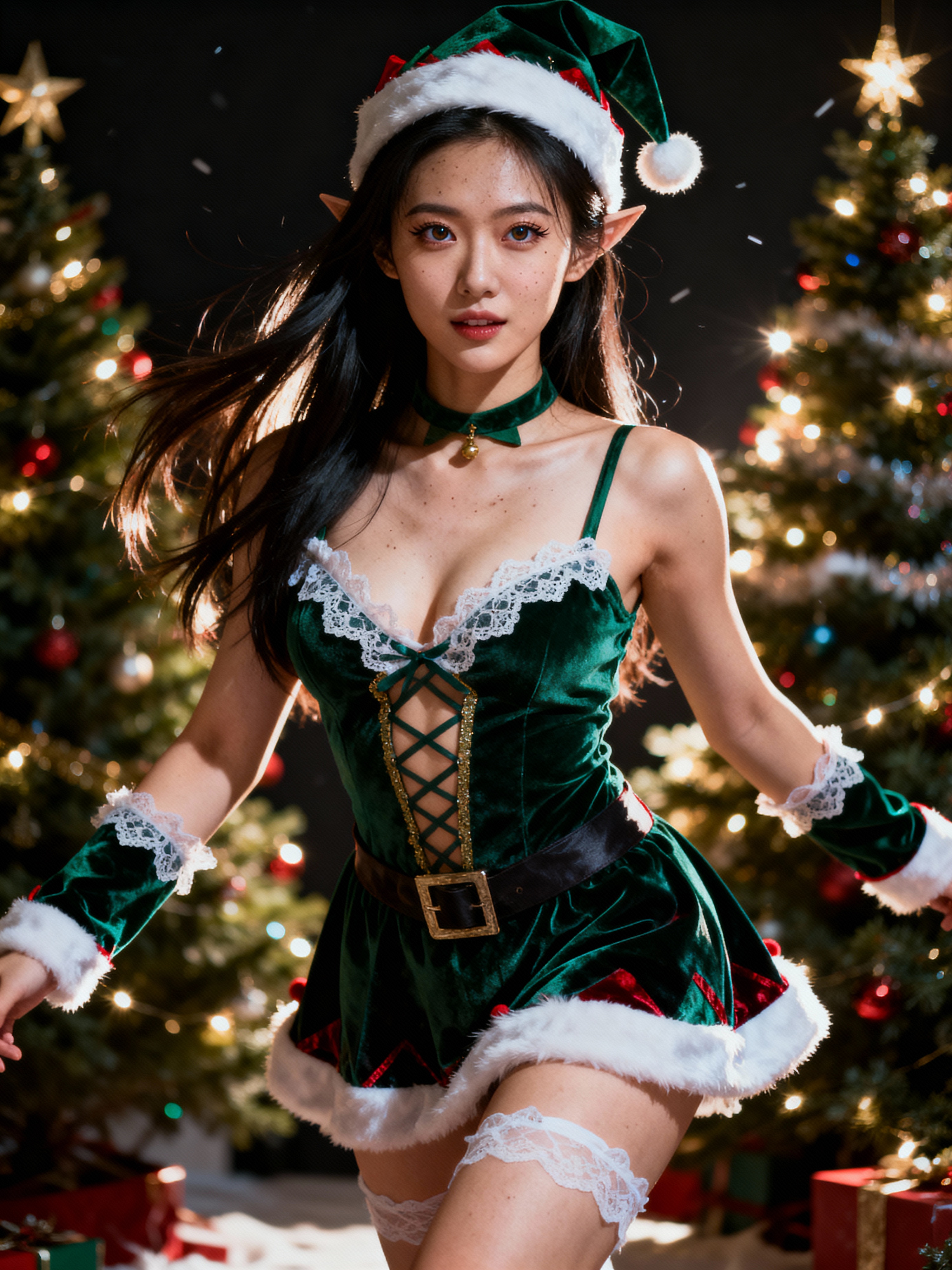 model wearing (naughty Christmas) (sexy Christmas costume) elf outfit posing for photo