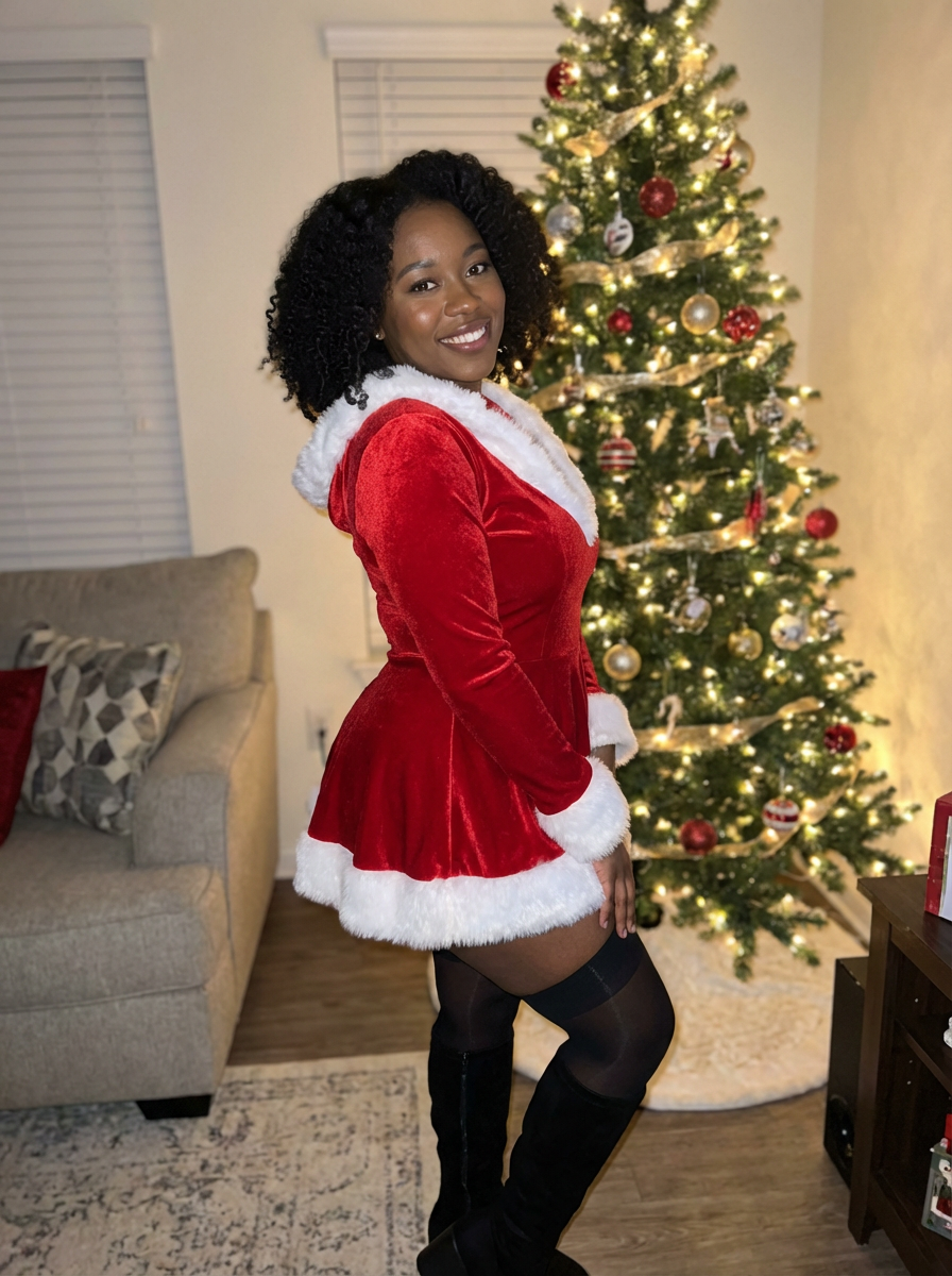 model wearing (naughty Christmas) (sexy Christmas costume) festive outfit posing for photo, background is Christmas tree and lights