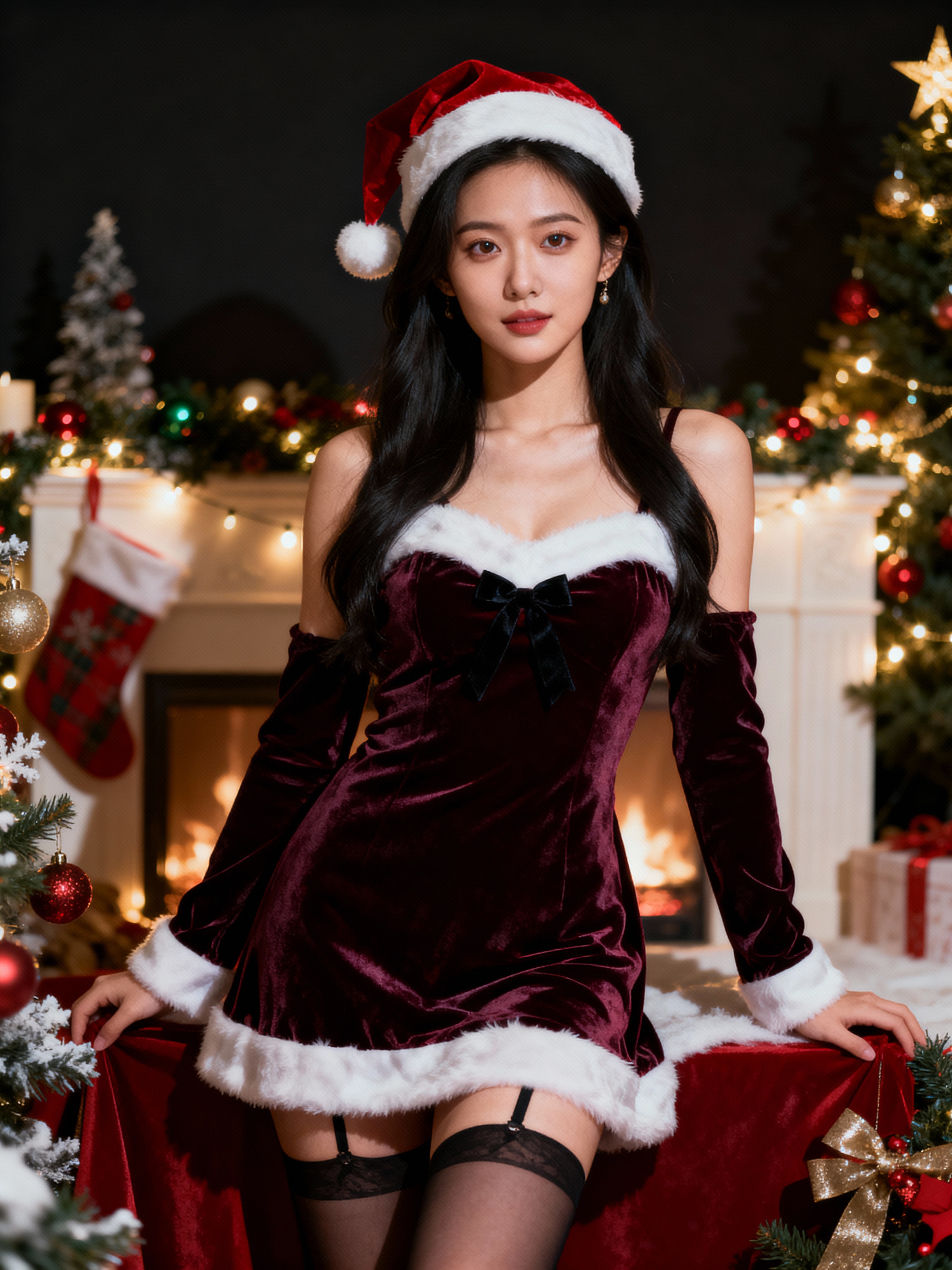 model wearing (naughty Christmas) (sexy Christmas costume) (velvet dress) (Christmas outfit), festive outfit posing for photo, background is Christmas decorations and lights