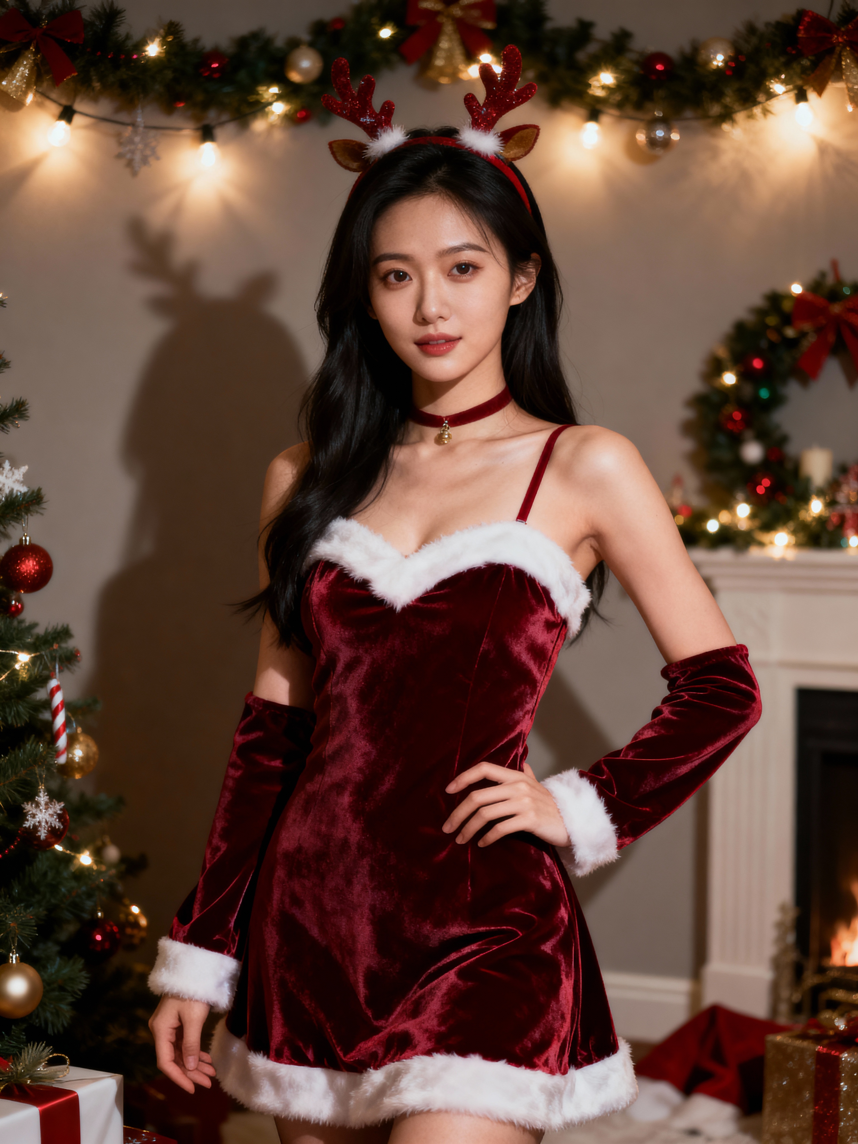 model wearing (naughty Christmas) (sexy Christmas costume) (velvet dress) (Christmas outfit), festive outfit posing for photo, background is Christmas decorations and lights