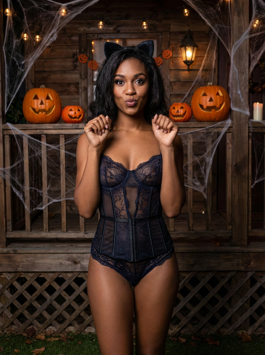 model wearing (naughty halloween) (sexy halloween costume) (lingerie) (halloween outfit), spooky outfit posing for photo, background is halloween pumpkins and spiderwebs