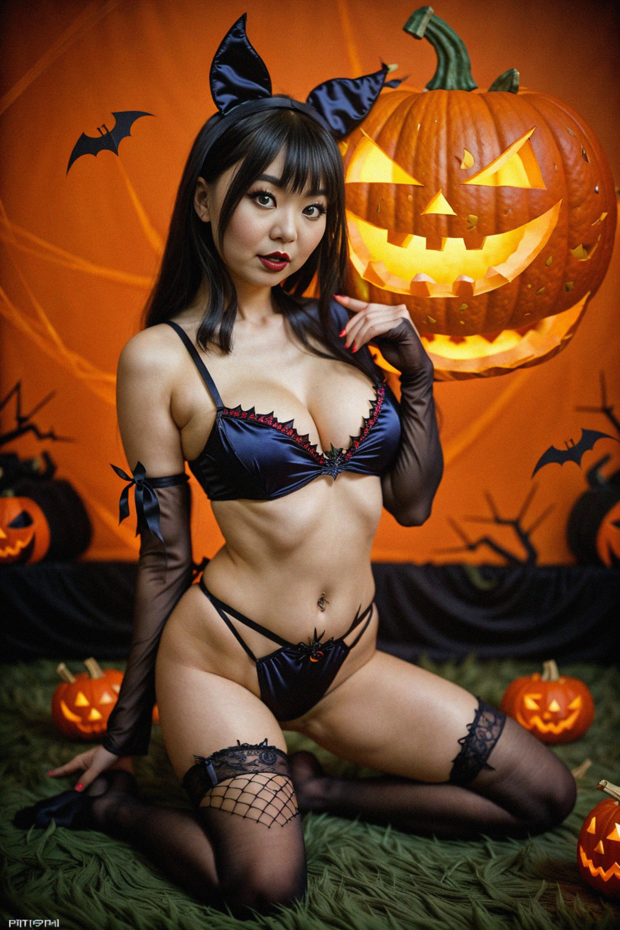 model wearing (naughty halloween) (sexy halloween costume) (stockings) (halloween outfit), spooky outfit posing for photo, background is halloween pumpkins and spiderwebs