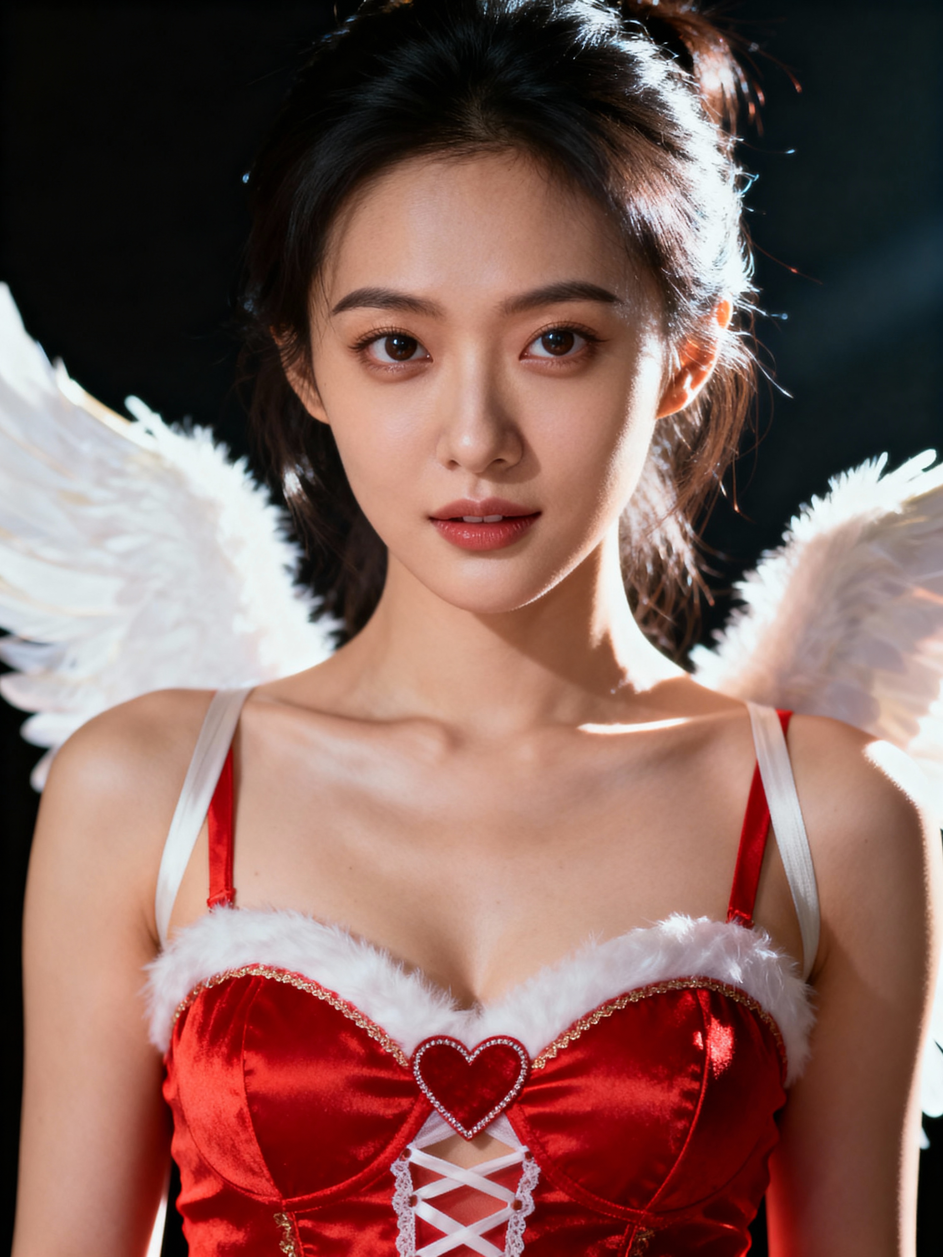 model wearing (naughty Valentine) (sexy Valentine\'s costume) cupid-inspired outfit posing for photo