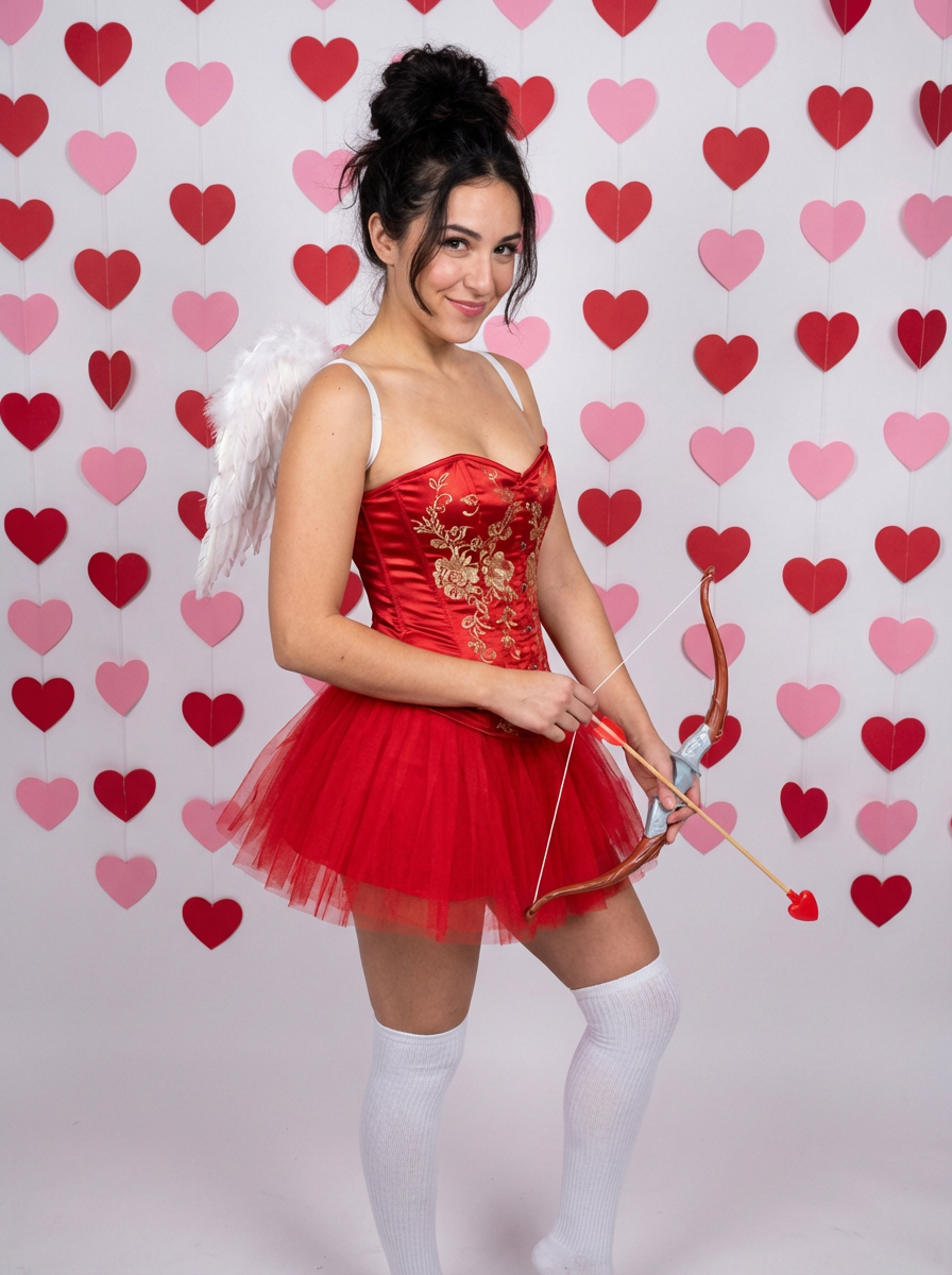 model wearing (naughty Valentine) (sexy Valentine\'s costume) cupid-inspired outfit posing for photo