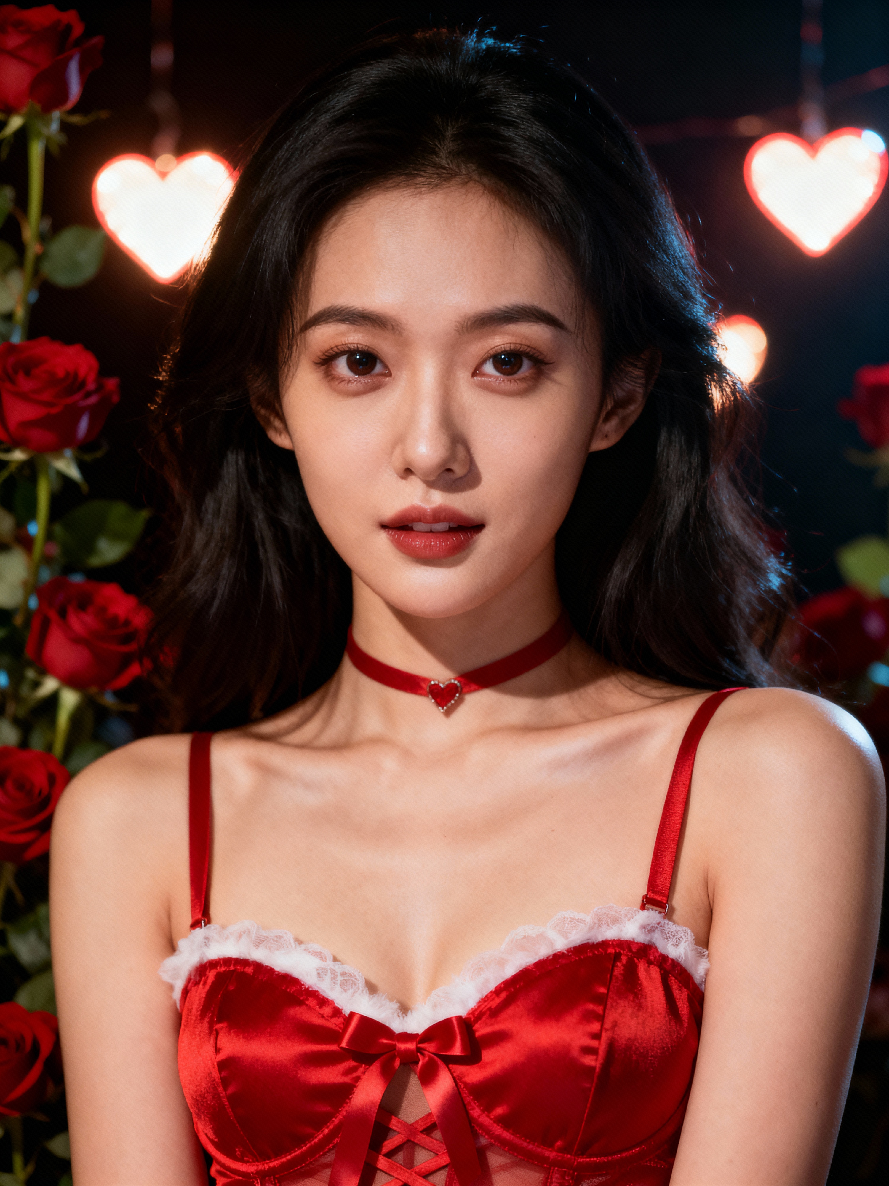 model wearing (naughty Valentine) (sexy Valentine\'s costume) festive outfit posing for a photo, background includes roses and heart-shaped lights