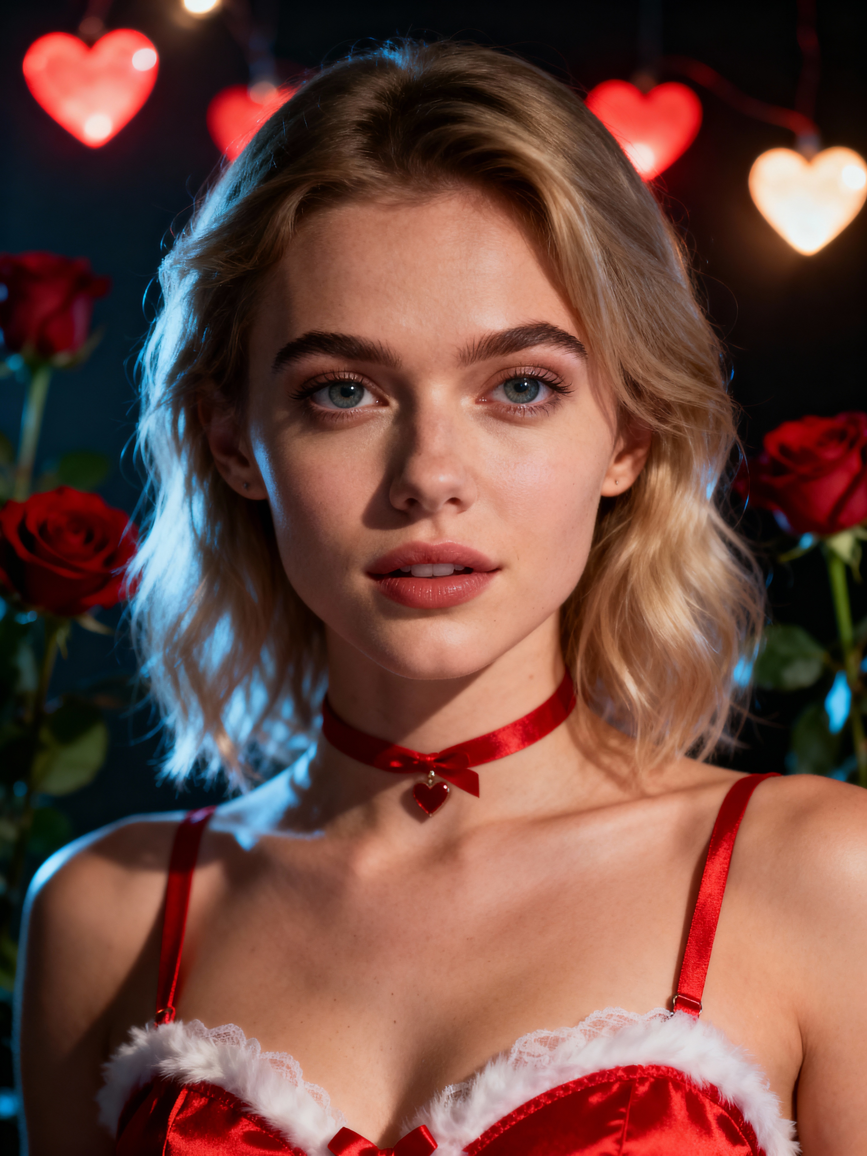 model wearing (naughty Valentine) (sexy Valentine\'s costume) festive outfit posing for a photo, background includes roses and heart-shaped lights