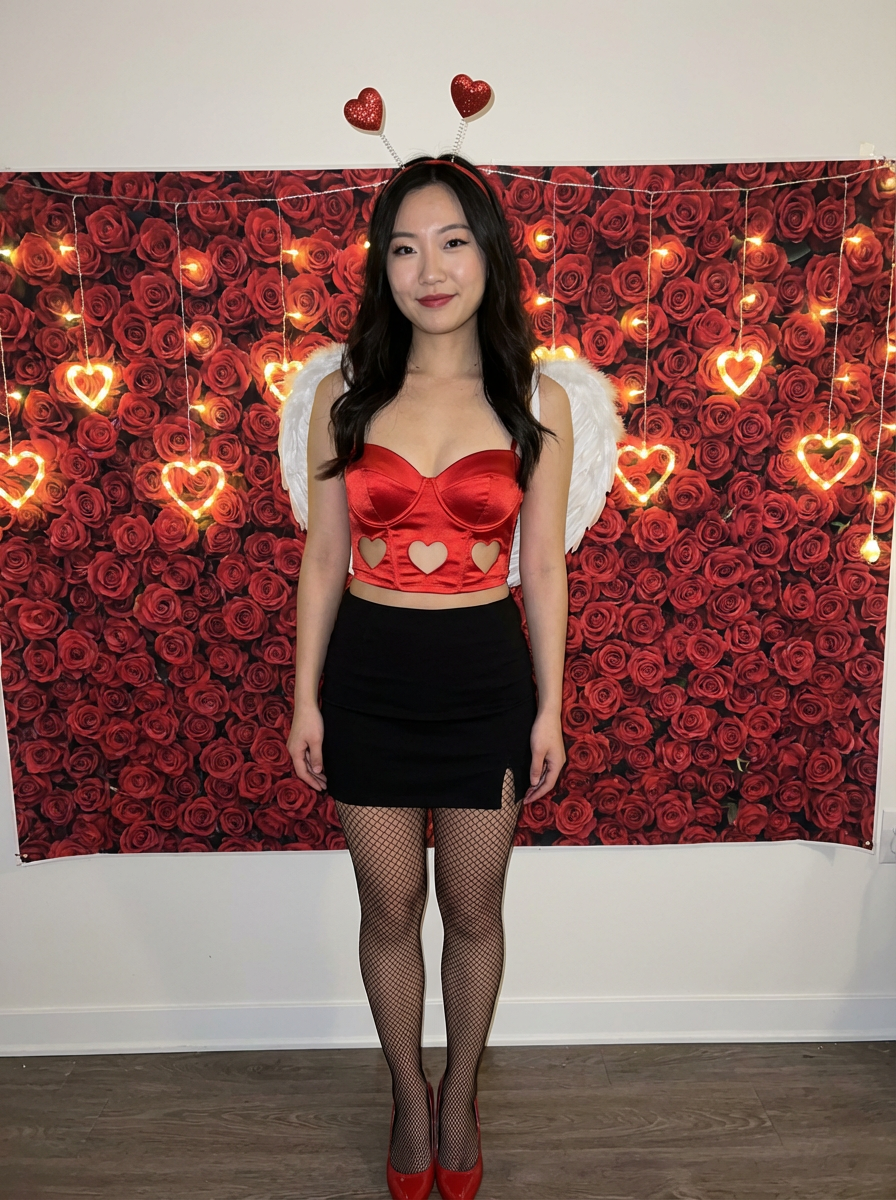 model wearing (naughty Valentine) (sexy Valentine\'s costume) festive outfit posing for a photo, background includes roses and heart-shaped lights