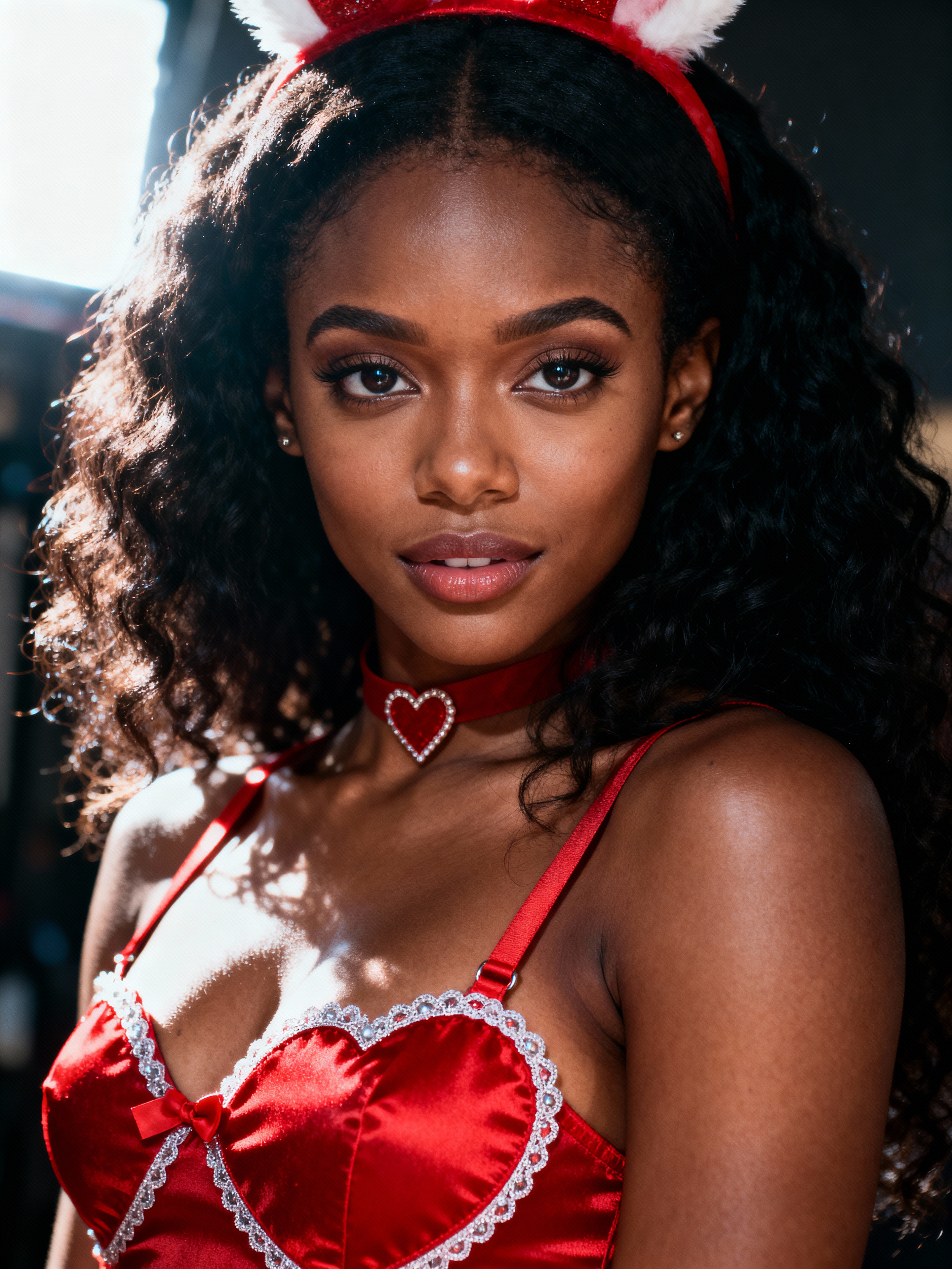 model wearing (naughty Valentine) (sexy Valentine\'s costume) heart-themed outfit posing for photo