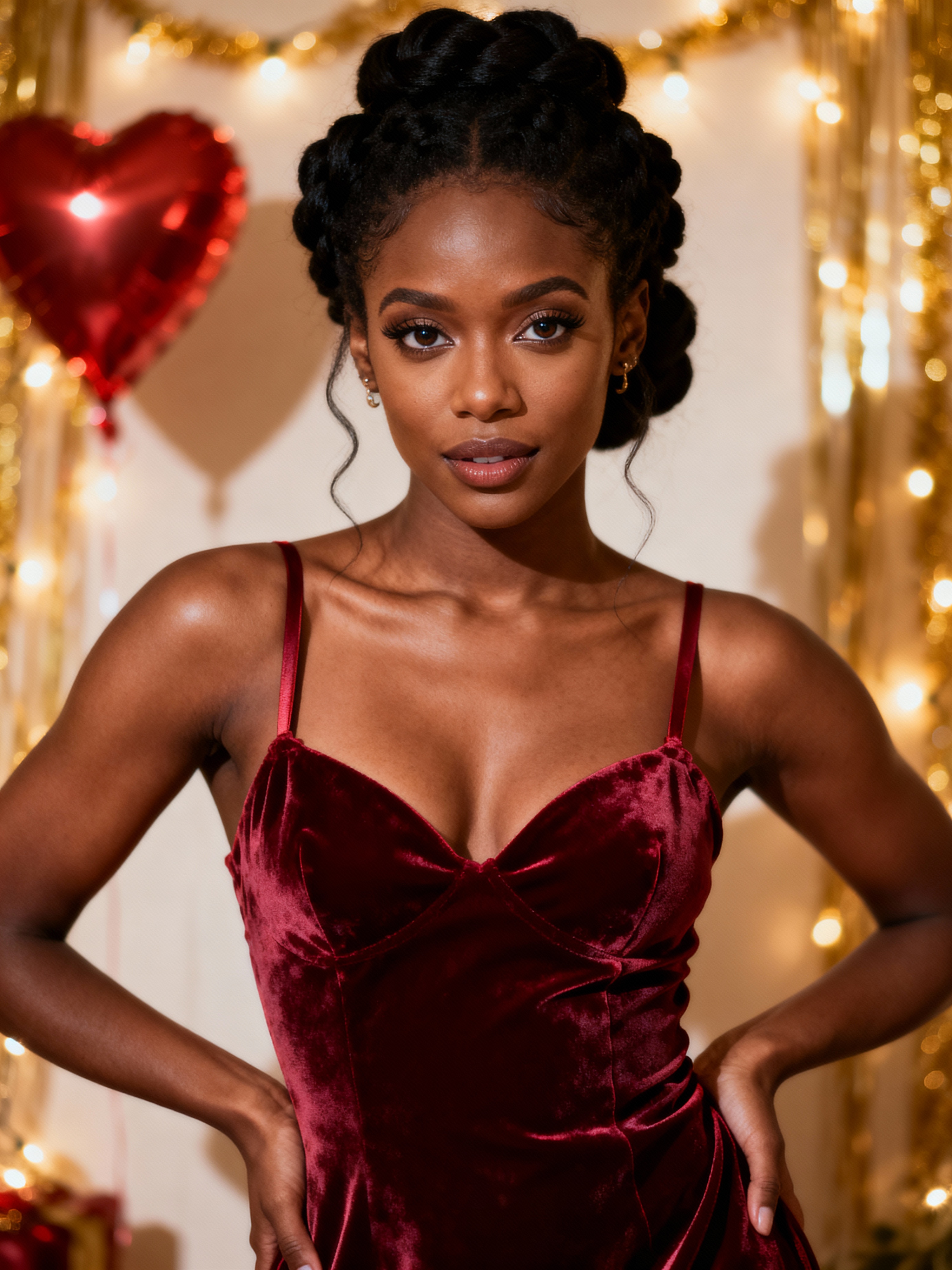 model wearing (naughty Valentine) (sexy Valentine\'s costume) (velvet dress) (Valentine\'s outfit), posing with romantic decorations and lights in the background