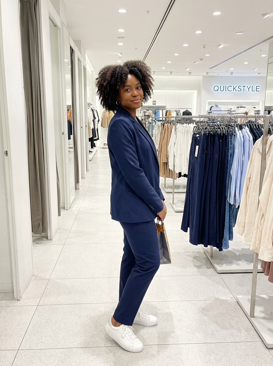 model wearing navy colopink pants suit in try on fashion shoot for Fast fashion brand