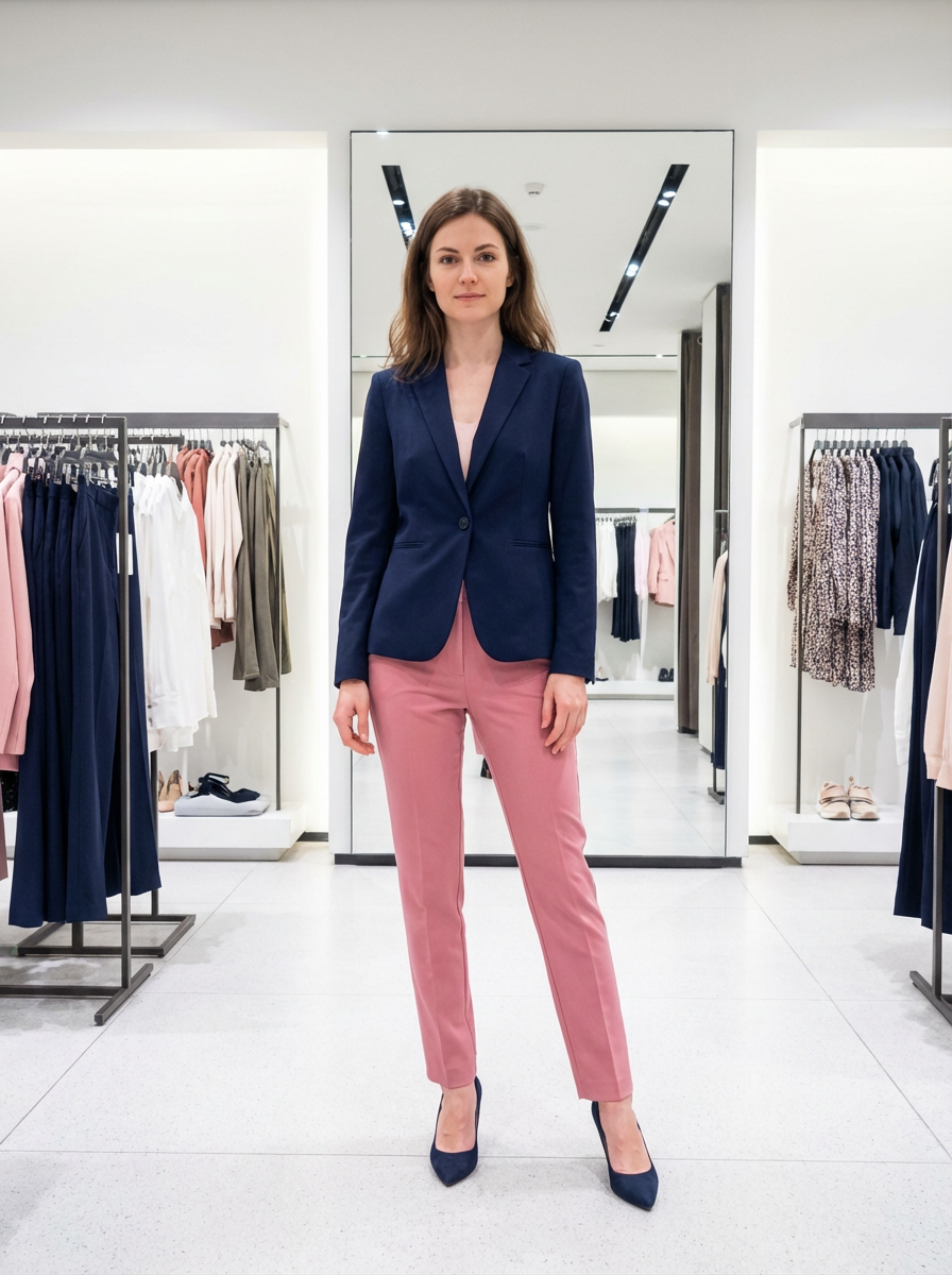 model wearing navy colopink pants suit in try on fashion shoot for Fast fashion brand