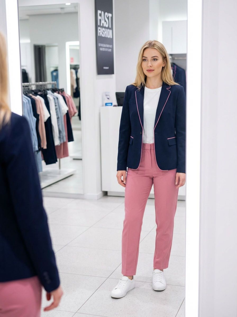 model wearing navy colopink pants suit in try on fashion shoot for Fast fashion brand