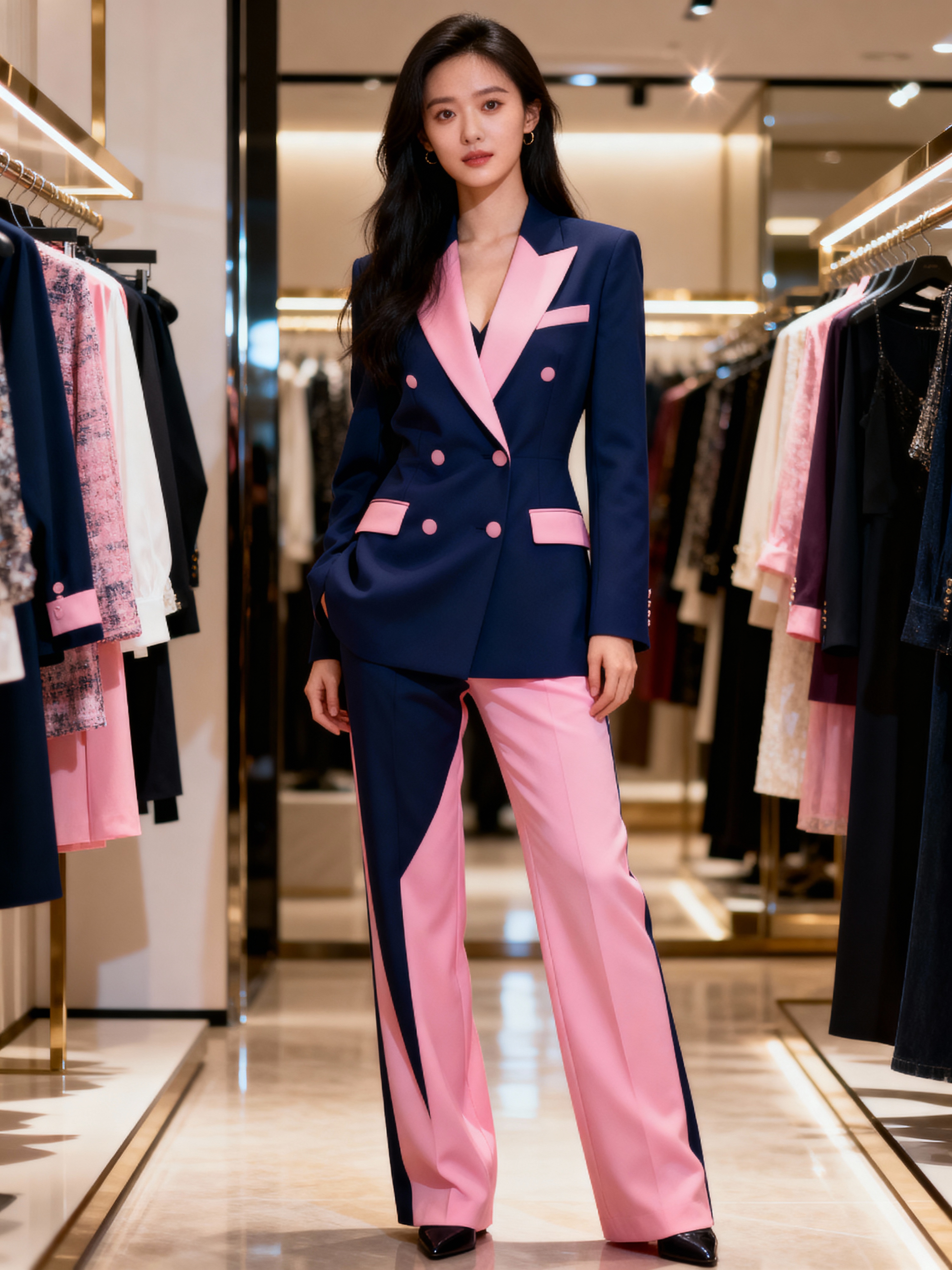 model wearing navy colopink pants suit in try on fashion shoot for Zara Shein H&M