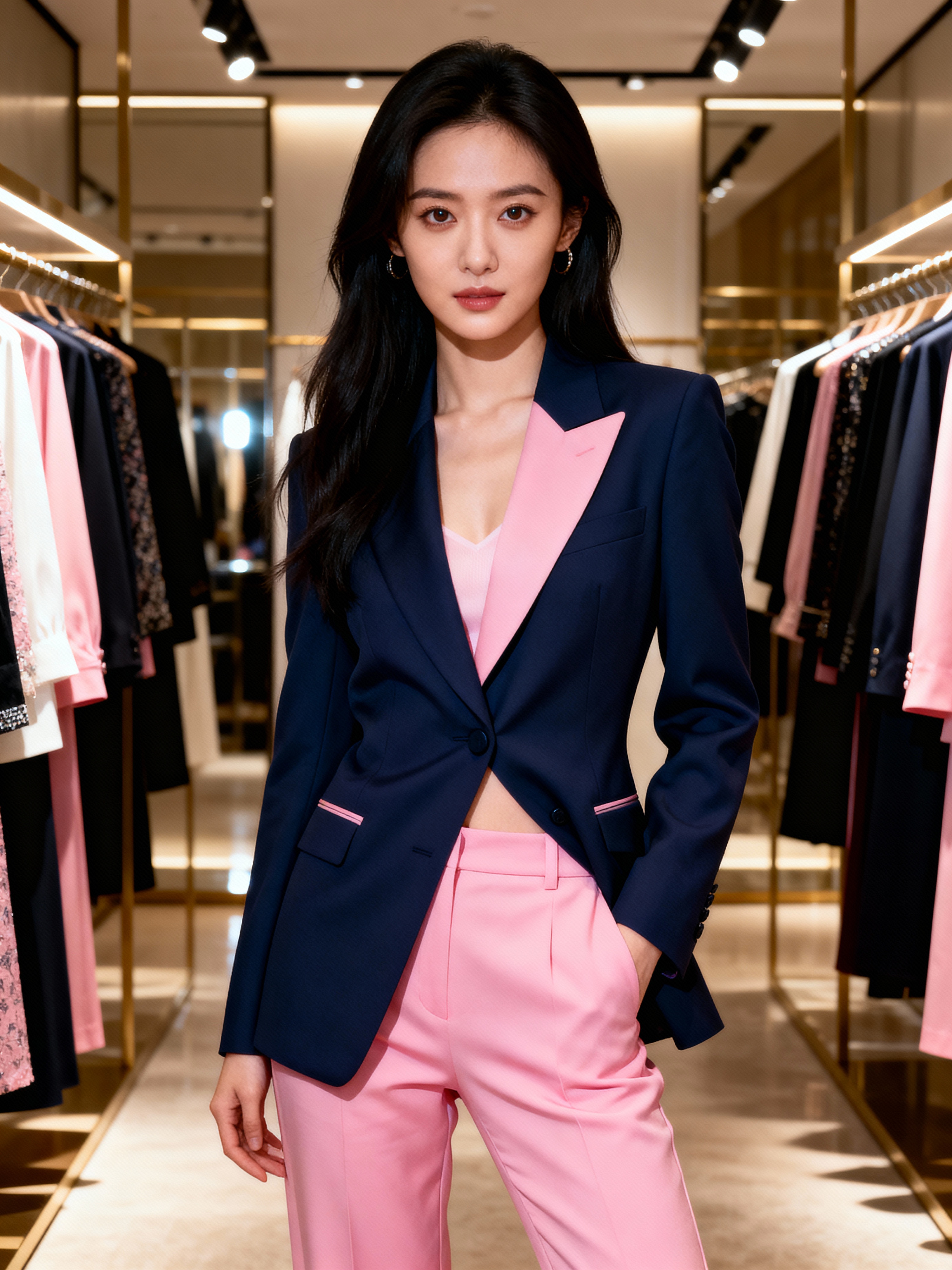 model wearing navy colopink pants suit in try on fashion shoot for Zara Shein H&M