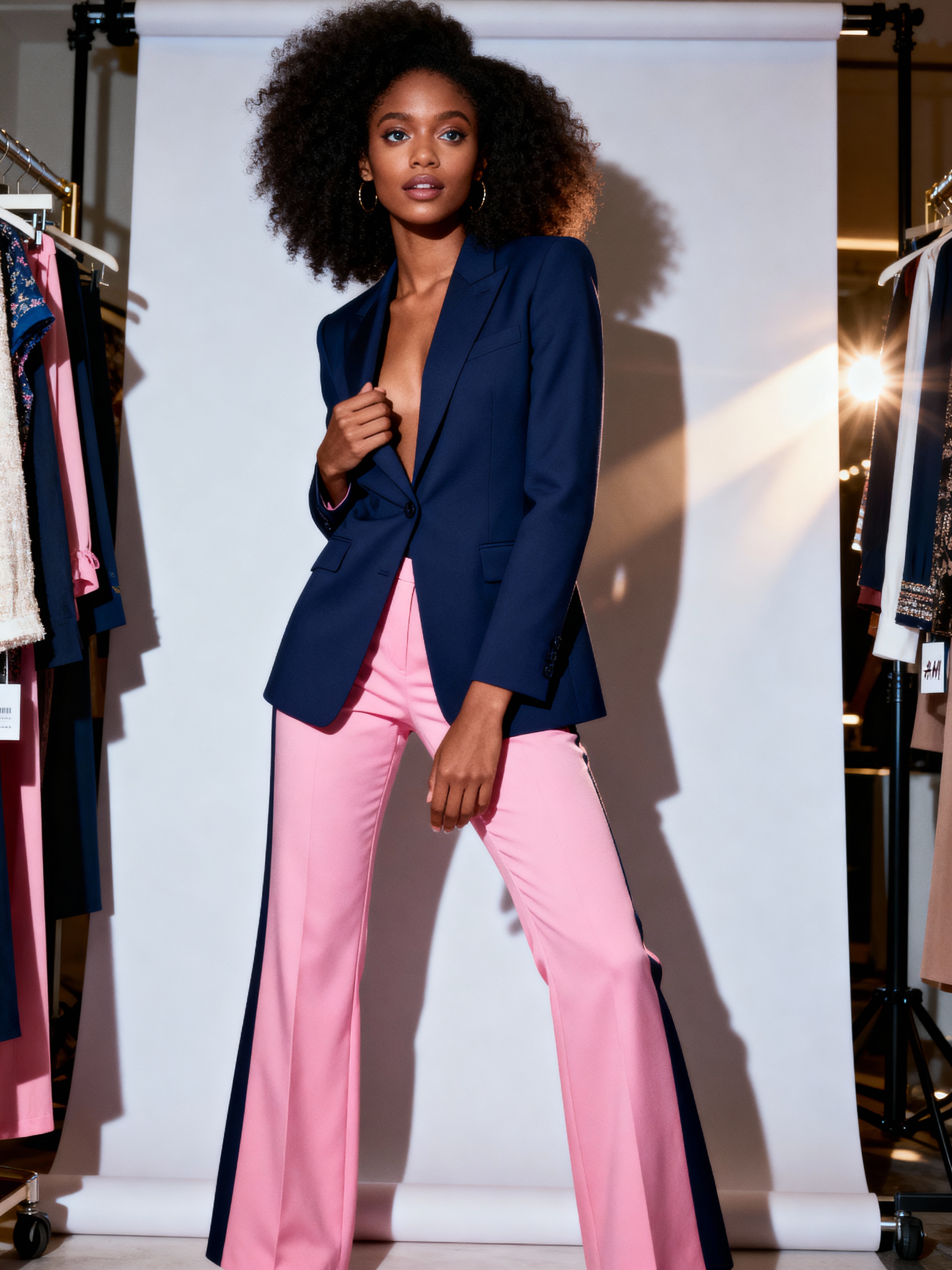 model wearing navy colopink pants suit in try on fashion shoot for Zara Shein H&M