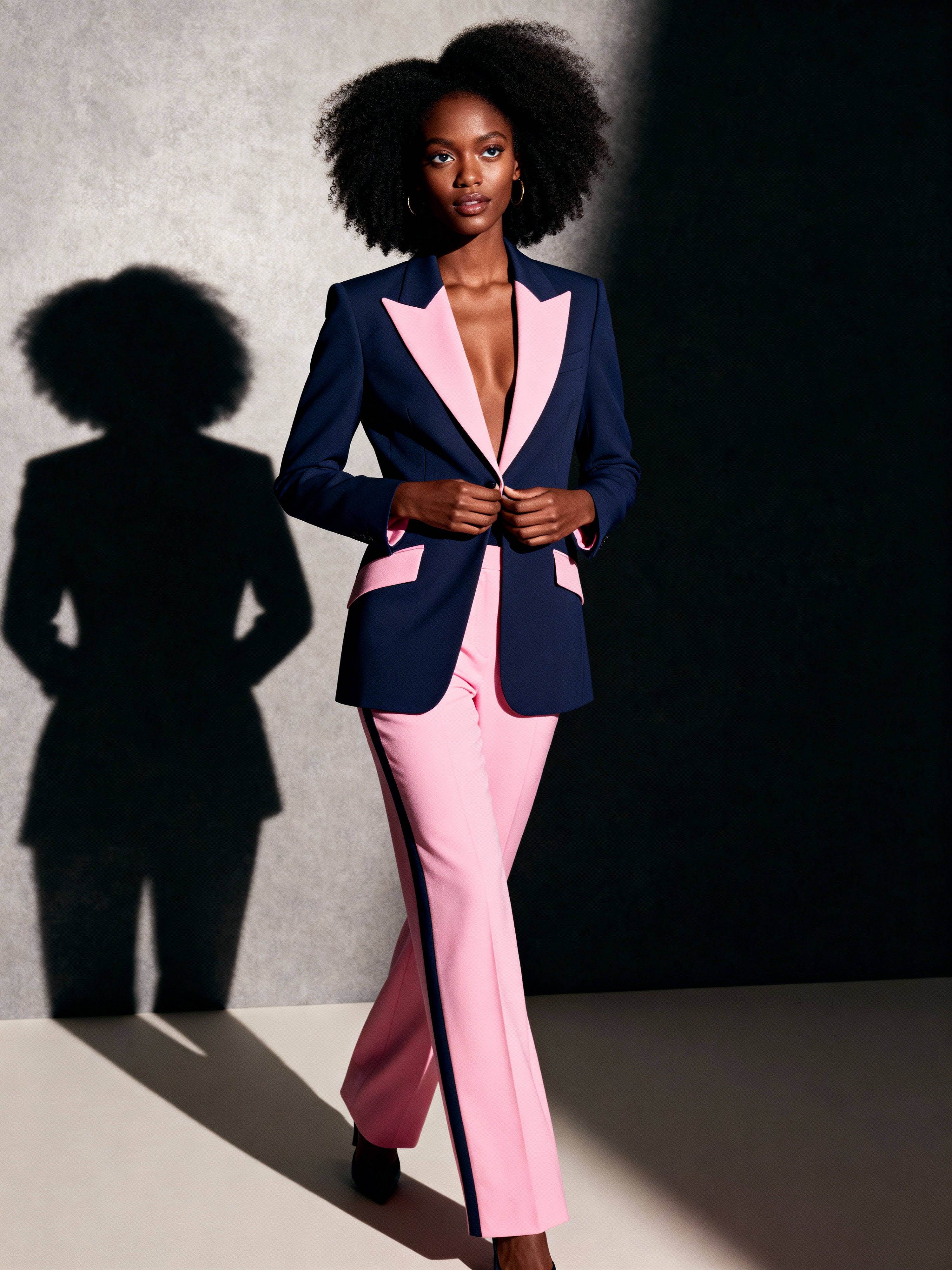 model wearing navy colopink pants suit in try on fashion shoot for Zara Shein H&M