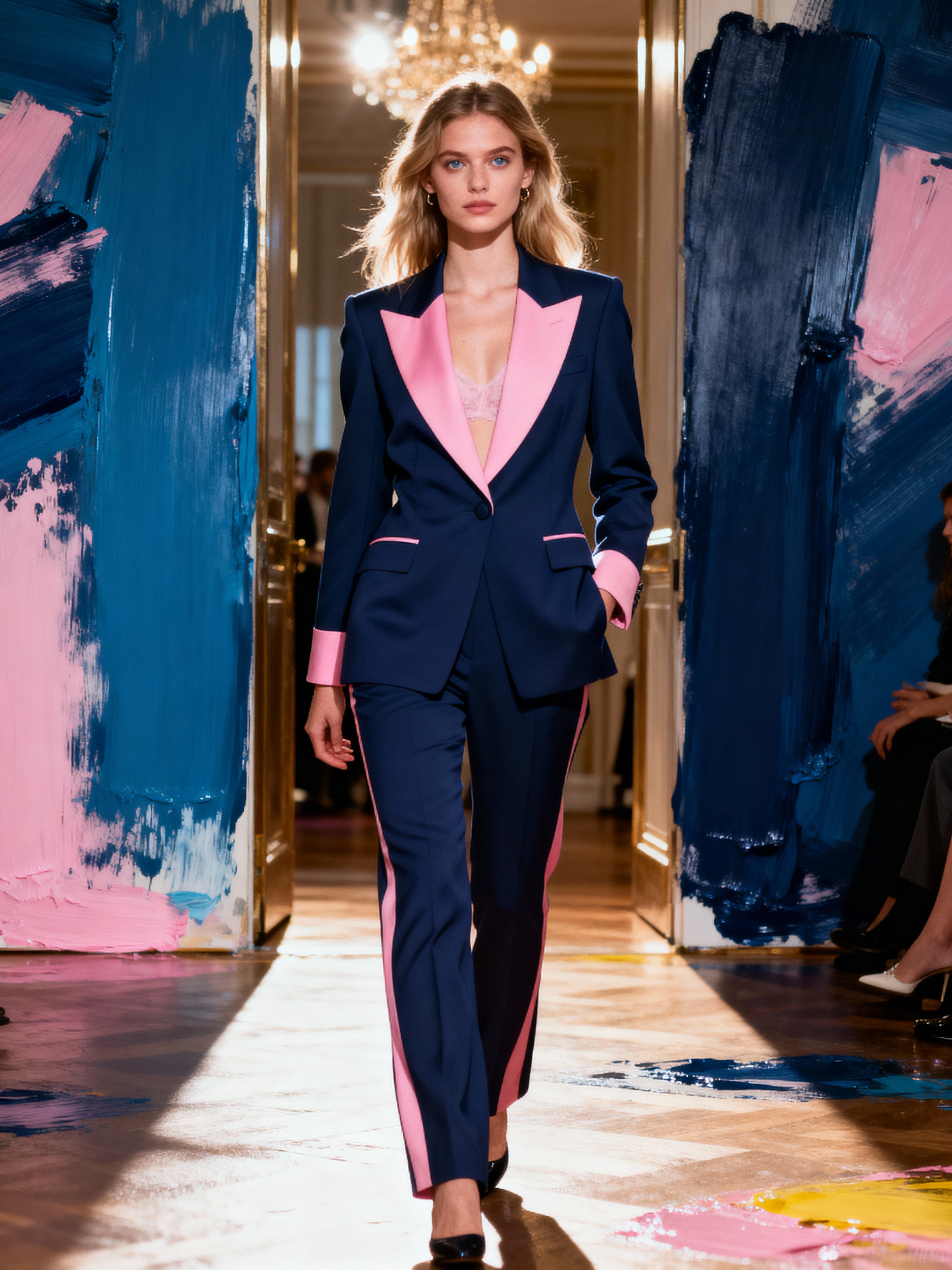 model wearing navy colopink pants suit in try on fashion shoot for Zara Shein H&M