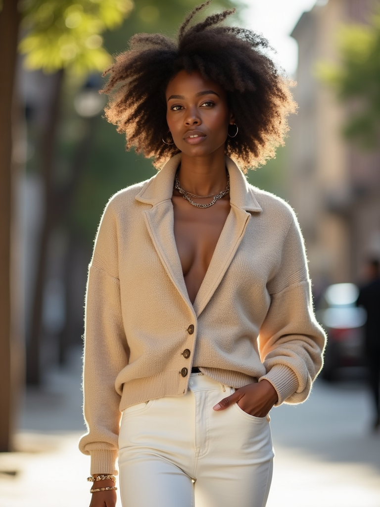 model wearing nude beige cardigan with white pants and leather accessories, walking outdoors in sunlight, fashion street style shoot