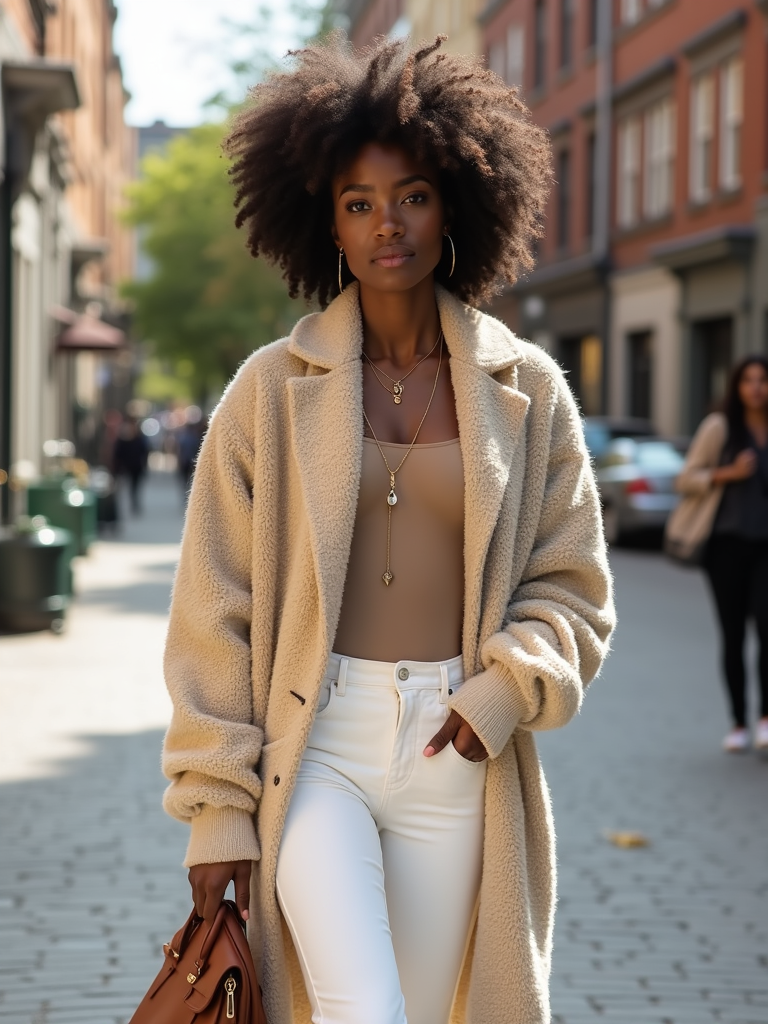 model wearing nude beige cardigan with white pants and leather accessories, walking outdoors in sunlight, fashion street style shoot