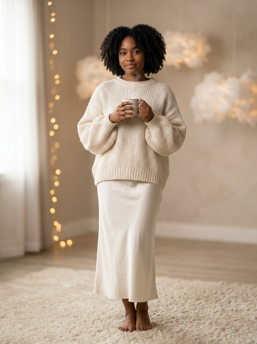 model wearing off-white oversized knit sweater with ivory silk skirt , cozy luxury aesthetic, cloud-like soft textures, warm studio lighting