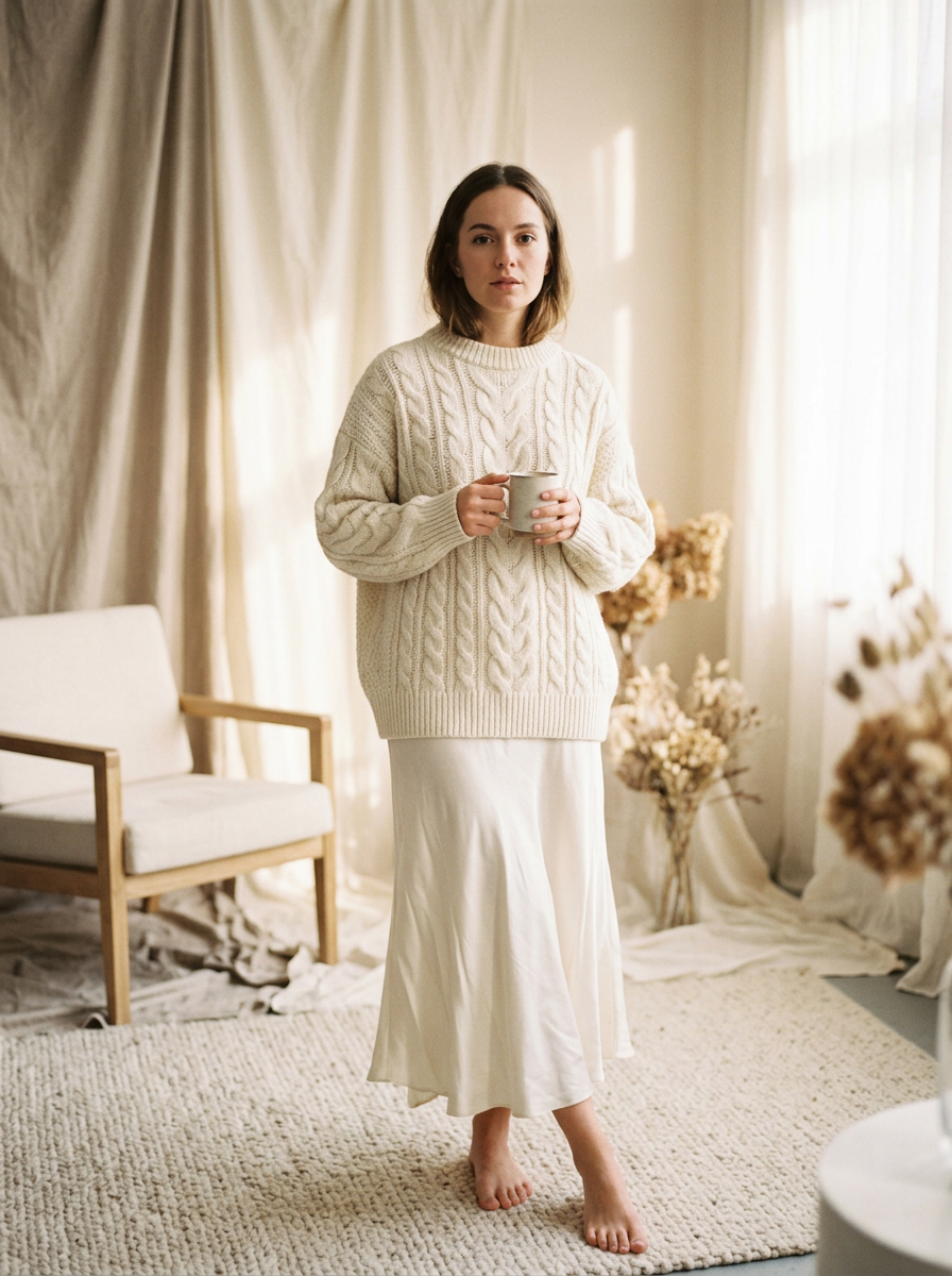 model wearing off-white oversized knit sweater with ivory silk skirt , cozy luxury aesthetic, cloud-like soft textures, warm studio lighting
