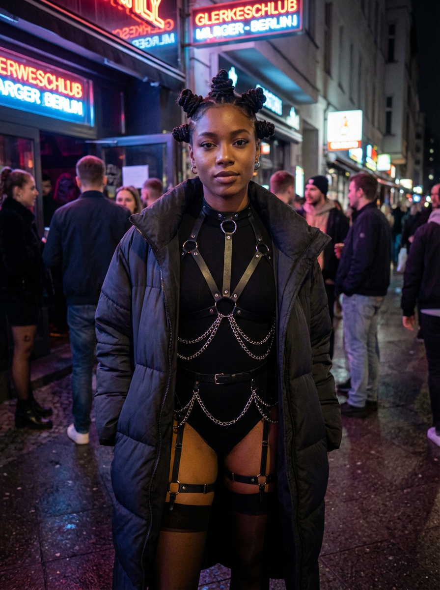 model, wearing oversized black puffer coat outside night club in berlin at night. underneath puffer coat she wears black swimsuit or bodysuit with garter straps, garter belts, bdsm harness, metal chains, braided knots hairstyle