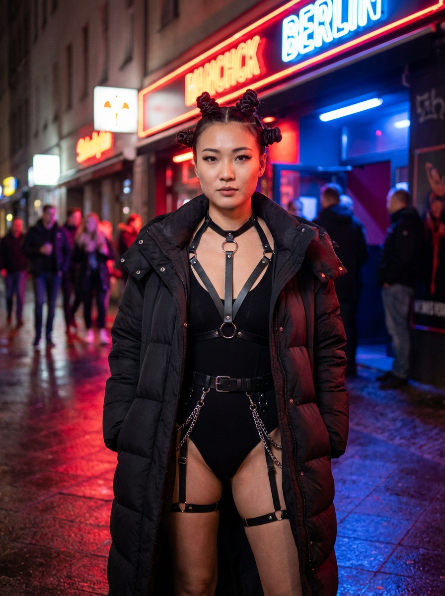 model, wearing oversized black puffer coat outside night club in berlin at night. underneath puffer coat she wears black swimsuit or bodysuit with garter straps, garter belts, bdsm harness, metal chains, braided knots hairstyle