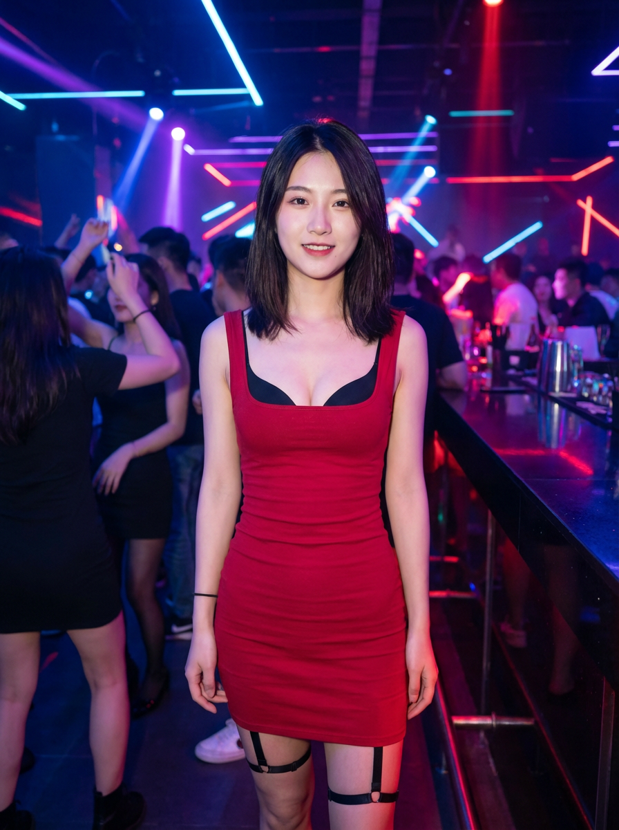 model wearing (red bodycon dress) with (black garter straps garter straps) in night club neon lights
