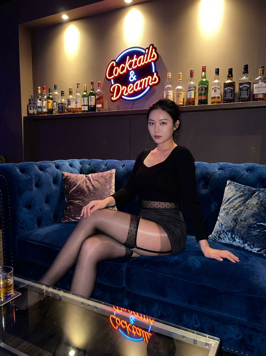 model wearing sheer black tights with garter straps holding them up, with the focus on the upper thigh and hip area. the fabric shows a subtle polka dot pattern on the waistband and a smooth, solid texture down the leg. bright lighting highlights the contours and shine of the material. she is sitting on a plush, blue, tufted sofa in a dimly lit lounge with neon red and yellow lighting. they are leaning against the back of the sofa, with one hand resting on their knee and the other on the sofa. behind them, a wall features a collection of bottles and a bright, cursive neon sign. two decorative pillows are positioned beside the model, adding to the chic ambiance. a reflective glass table is visible in the foreground.