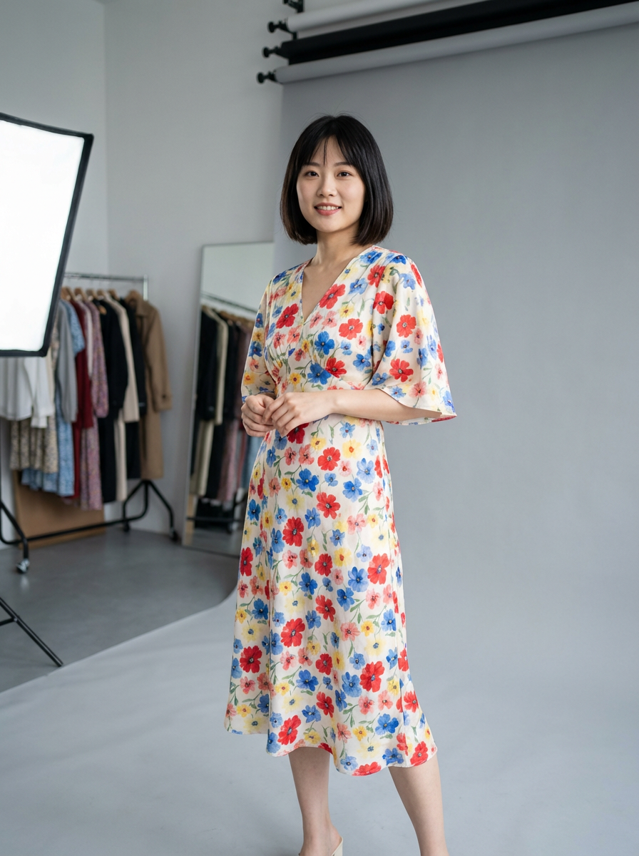 model wearing silk floral dress in try on fashion shoot for Fast fashion brand