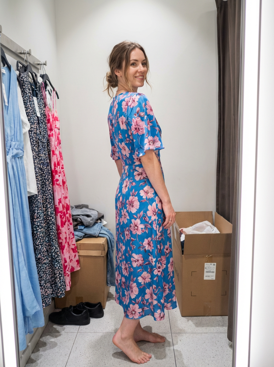 model wearing silk floral dress in try on fashion shoot for Fast fashion brand