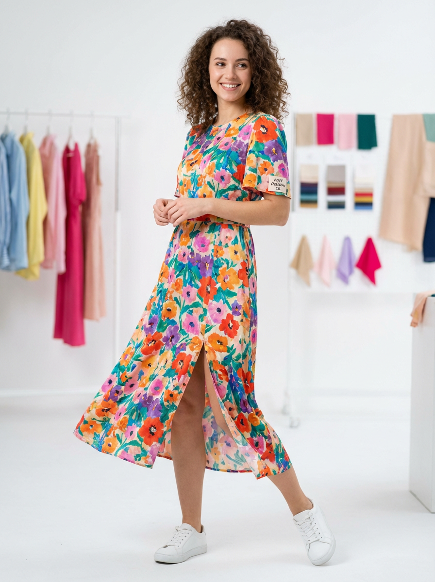 model wearing silk floral dress in try on fashion shoot for Fast fashion brand