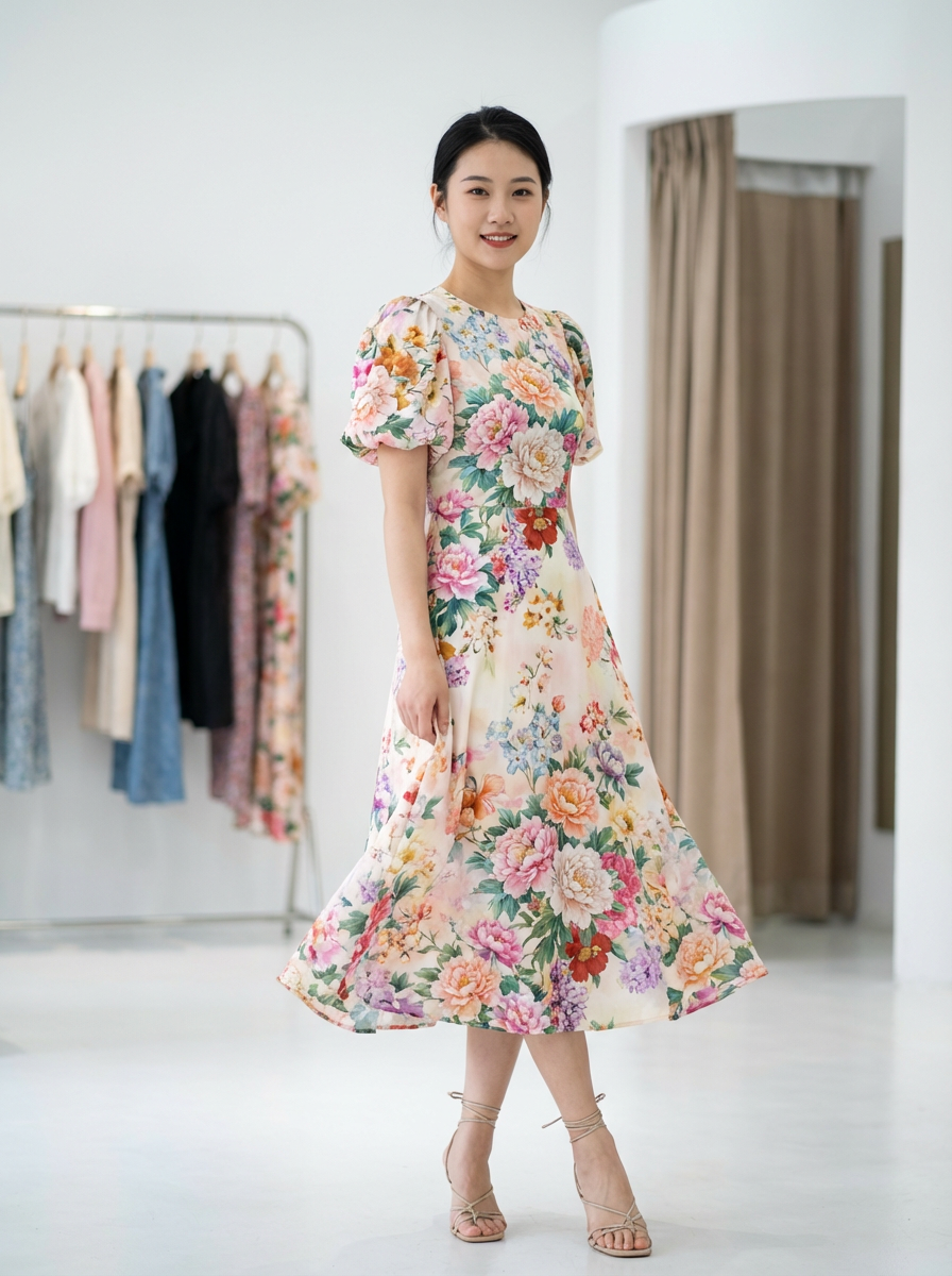 model wearing silk floral dress in try on fashion shoot for Fast fashion brand