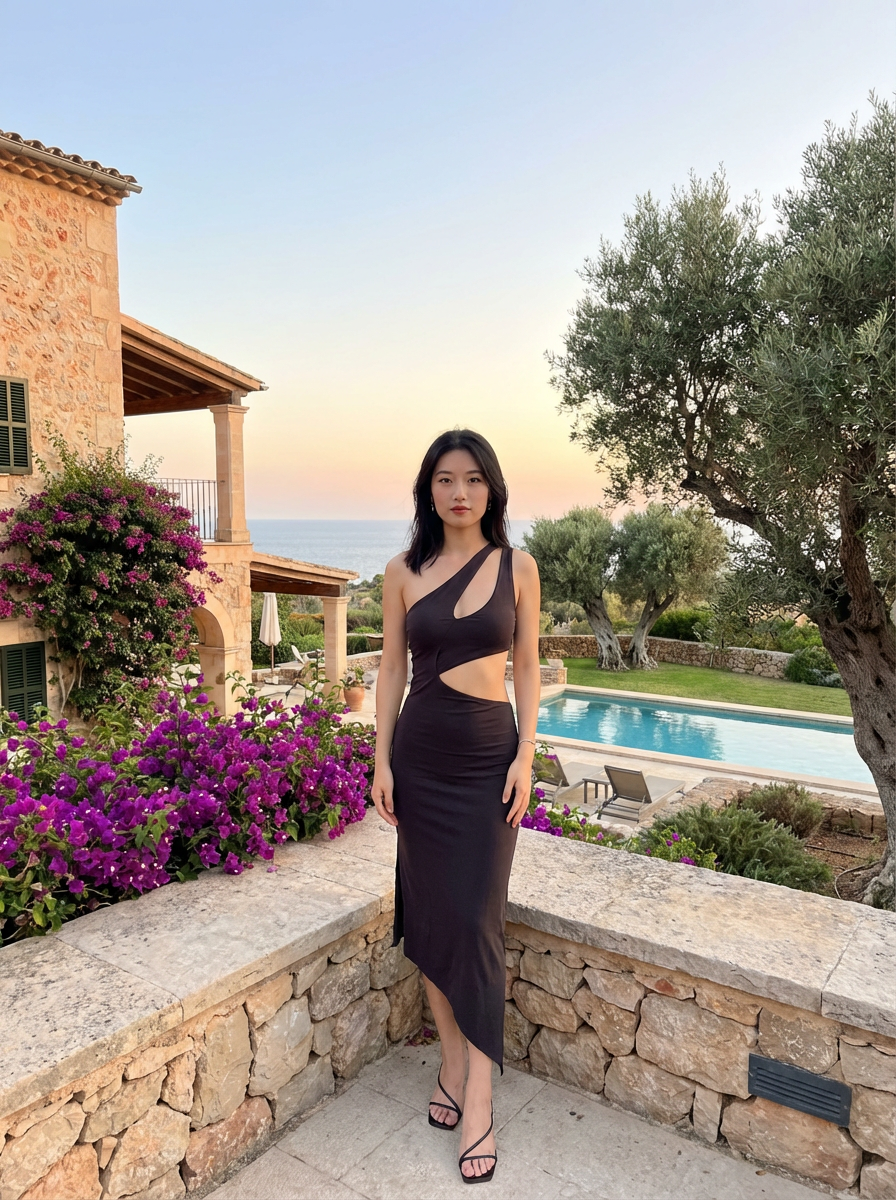 model wearing skimpy cut out dress at villa