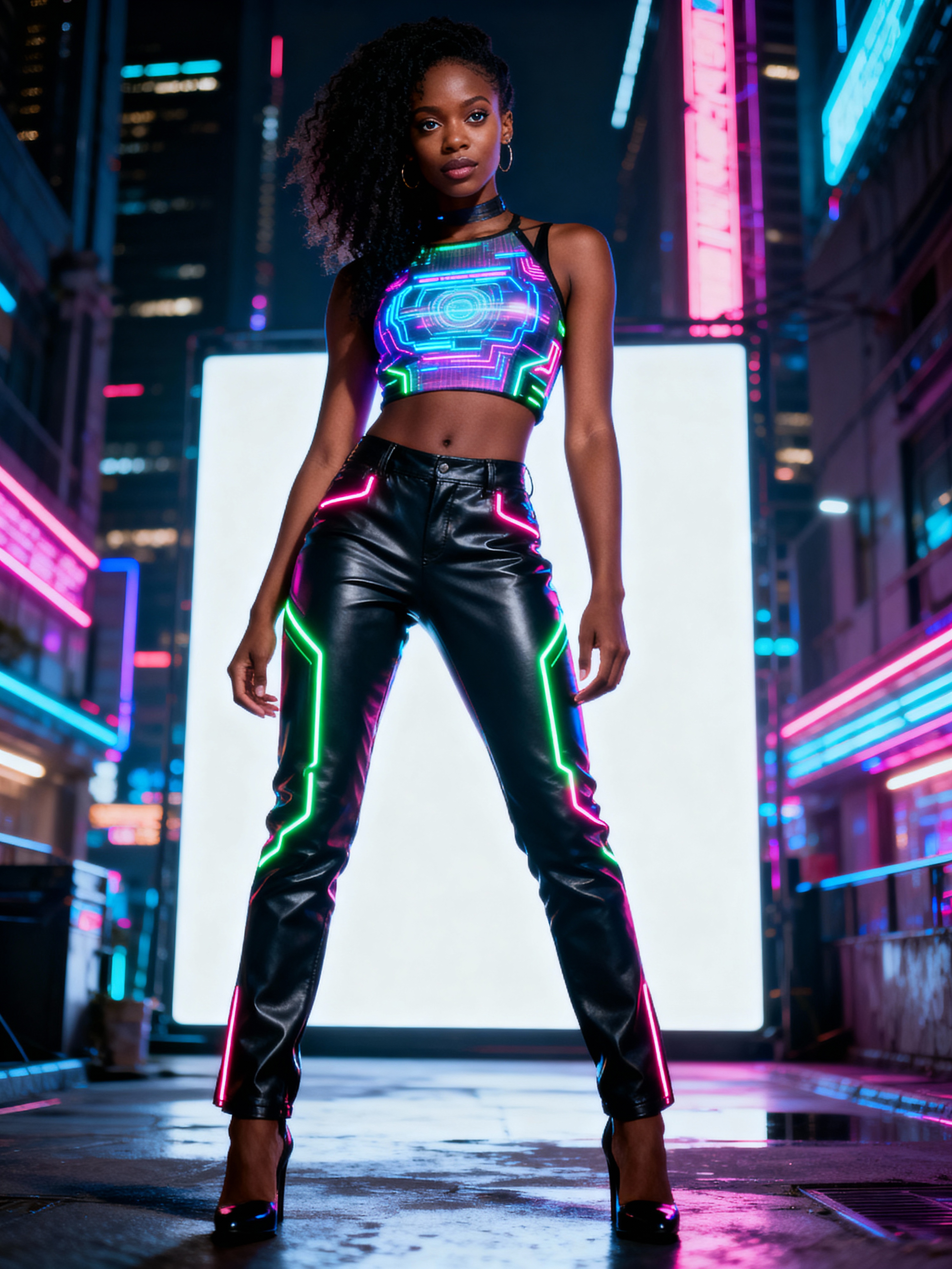 model wearing sleek leather pants with neon highlights and holographic top in a Bladerunner-inspired cityscape