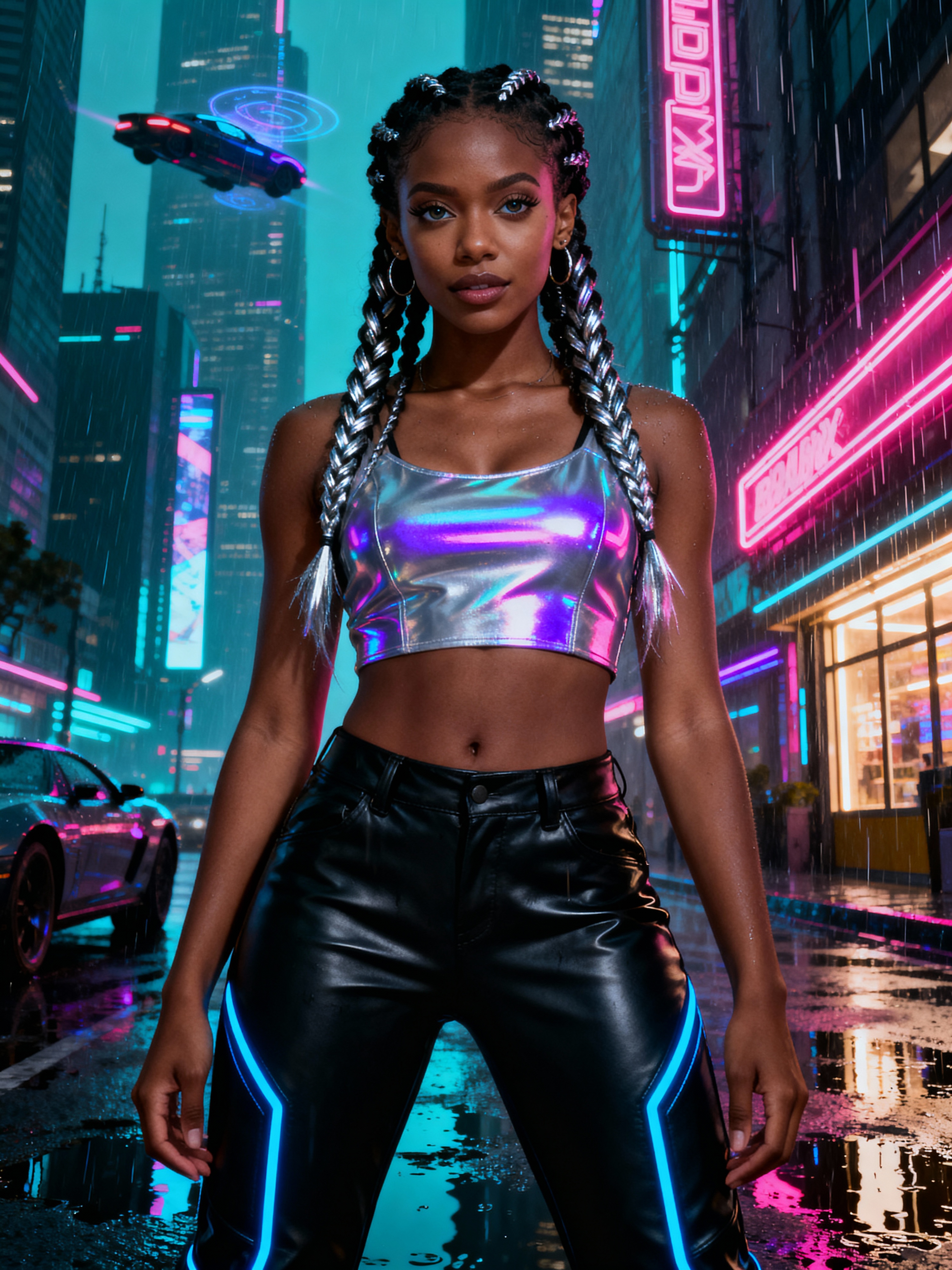 model wearing sleek leather pants with neon highlights and holographic top in a Bladerunner-inspired cityscape