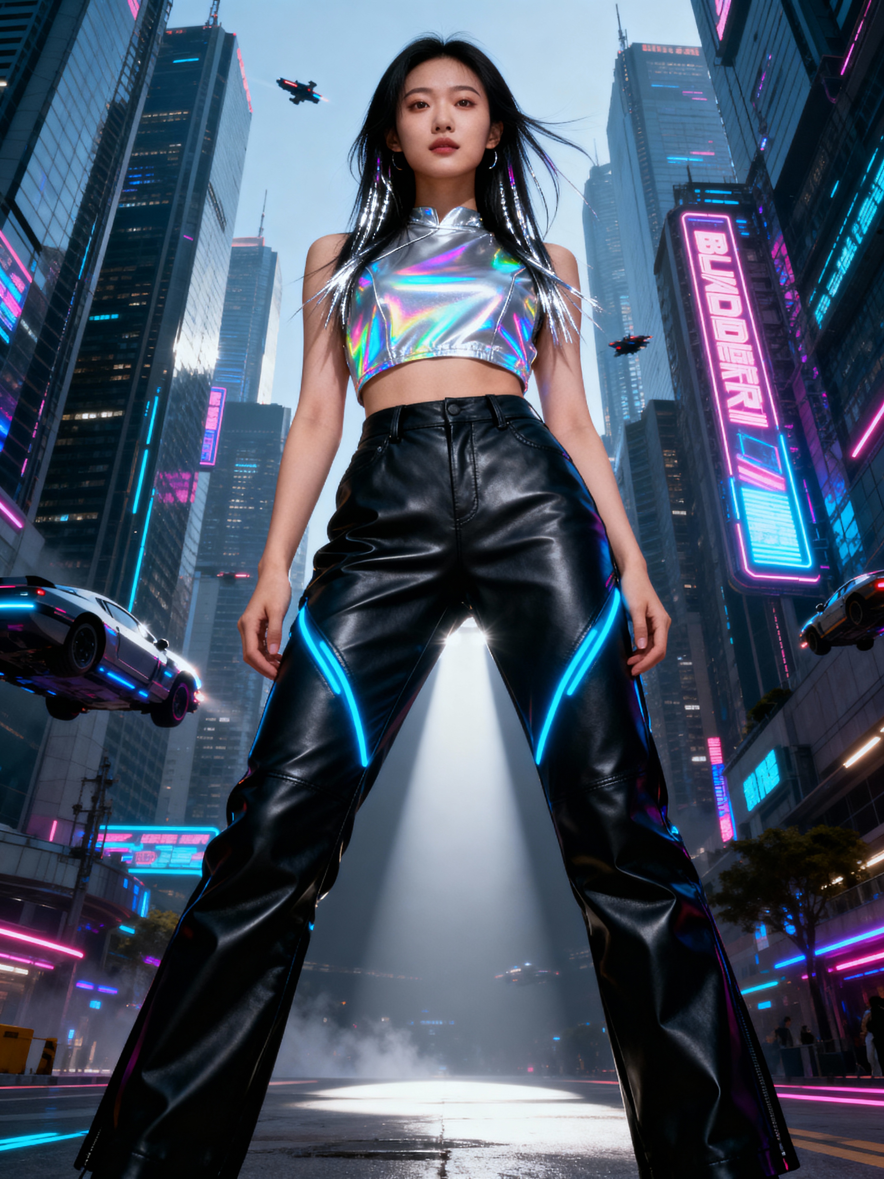 model wearing sleek leather pants with neon highlights and holographic top in a Bladerunner-inspired cityscape
