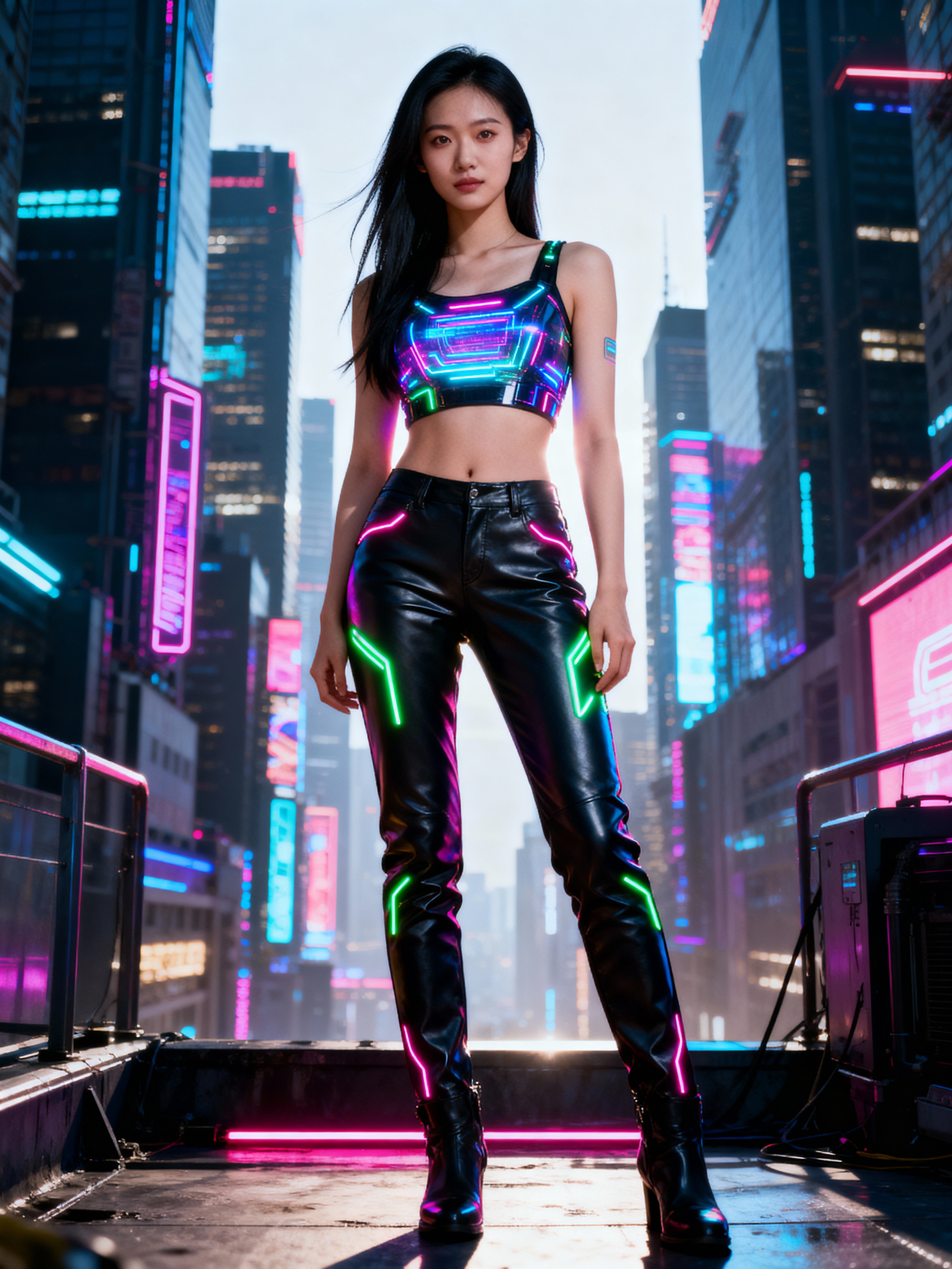 model wearing sleek leather pants with neon highlights and holographic top in a Bladerunner-inspired cityscape