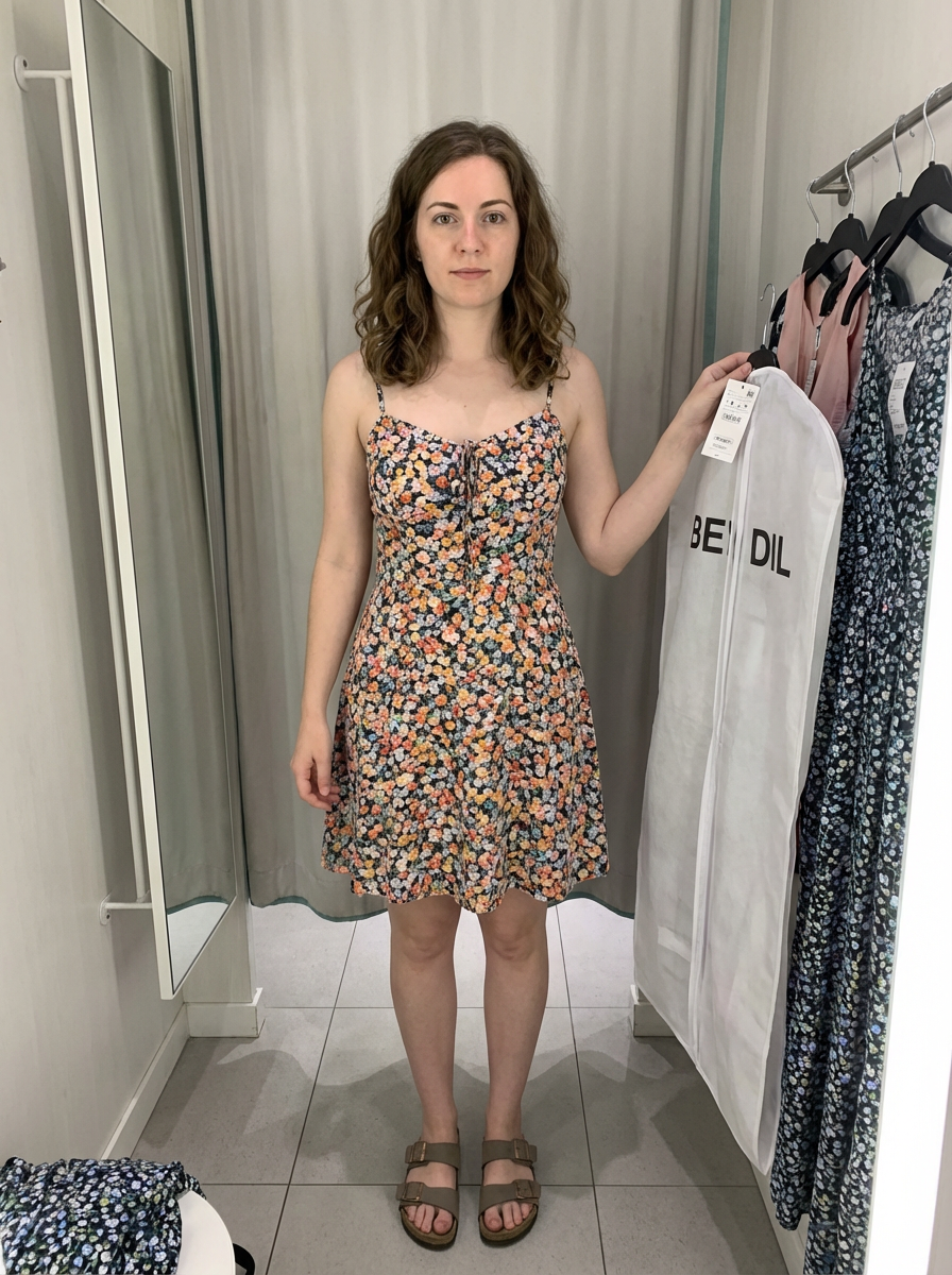 model wearing summer dress in try on fashion shoot for Fast fashion brand