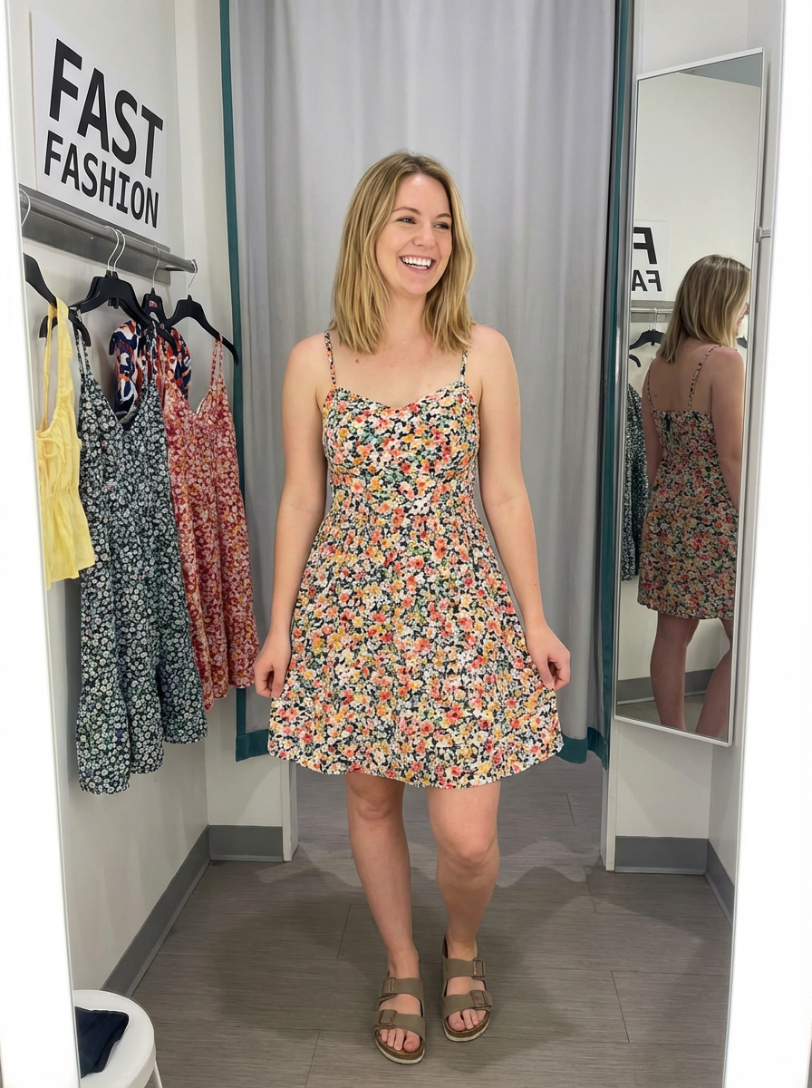model wearing summer dress in try on fashion shoot for Fast fashion brand