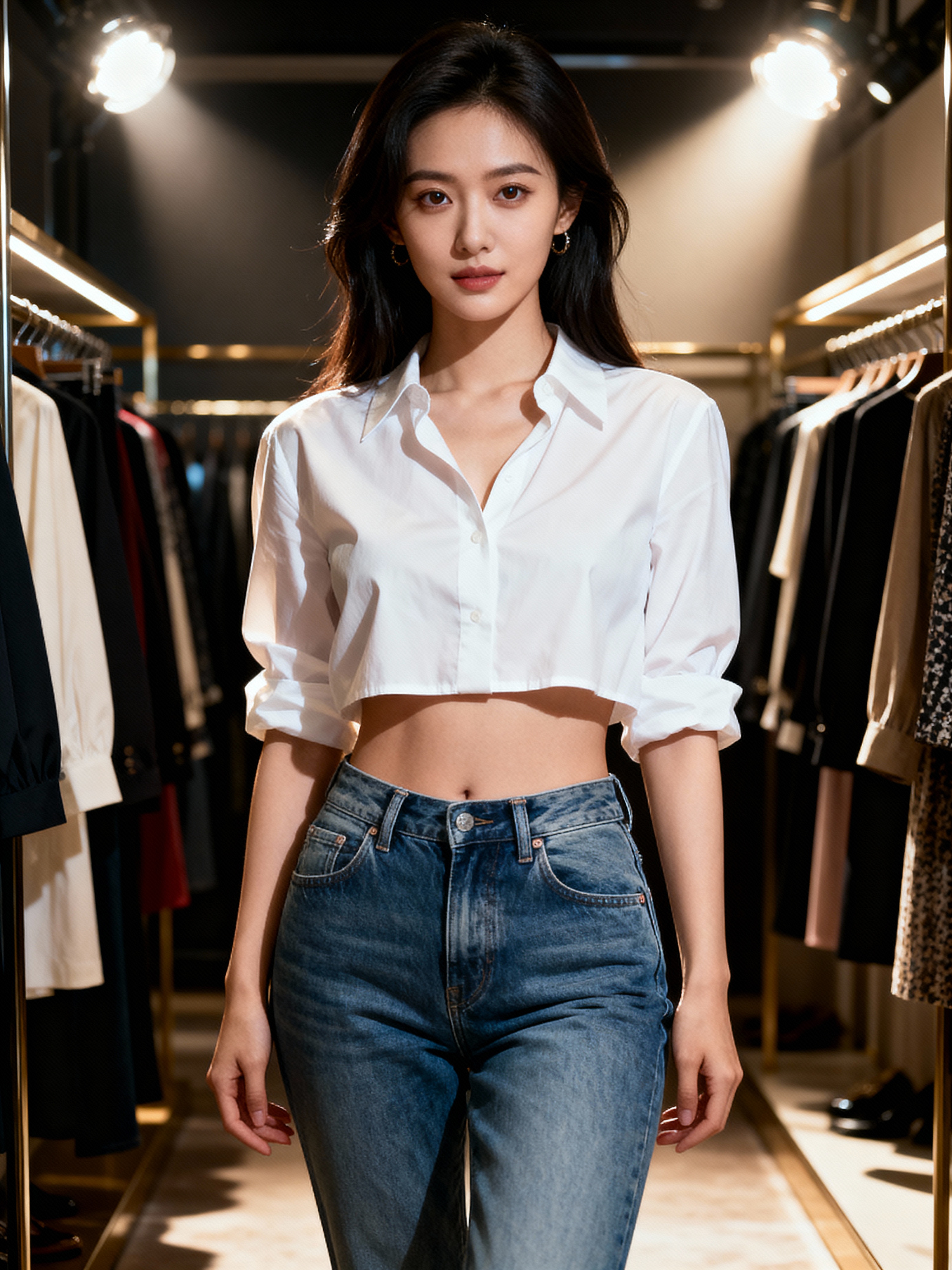 model wearing white cropped blouse and denim jeans in try on fashion shoot for Zara Shein H&M