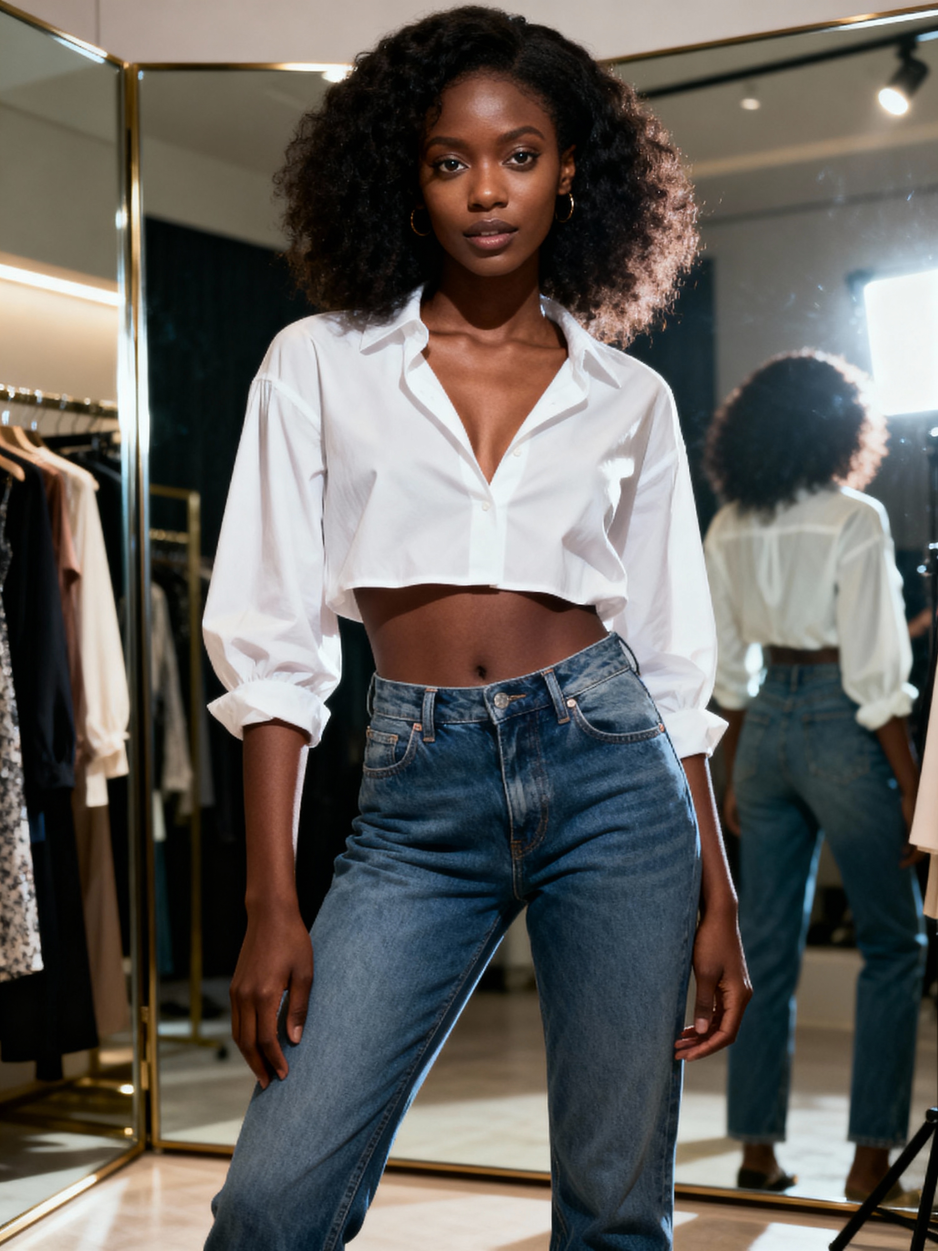 model wearing white cropped blouse and denim jeans in try on fashion shoot for Zara Shein H&M