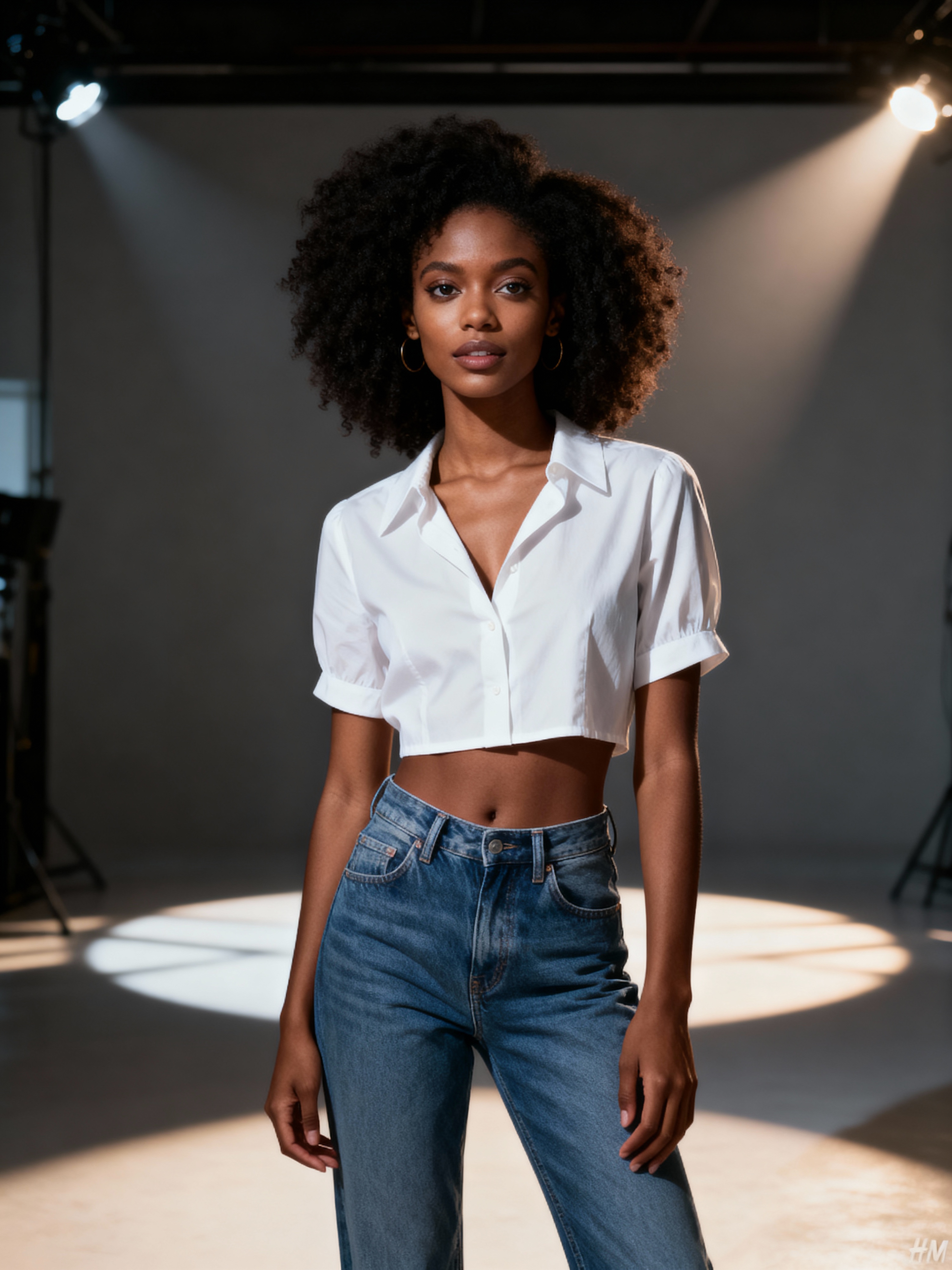 model wearing white cropped blouse and denim jeans in try on fashion shoot for Zara Shein H&M