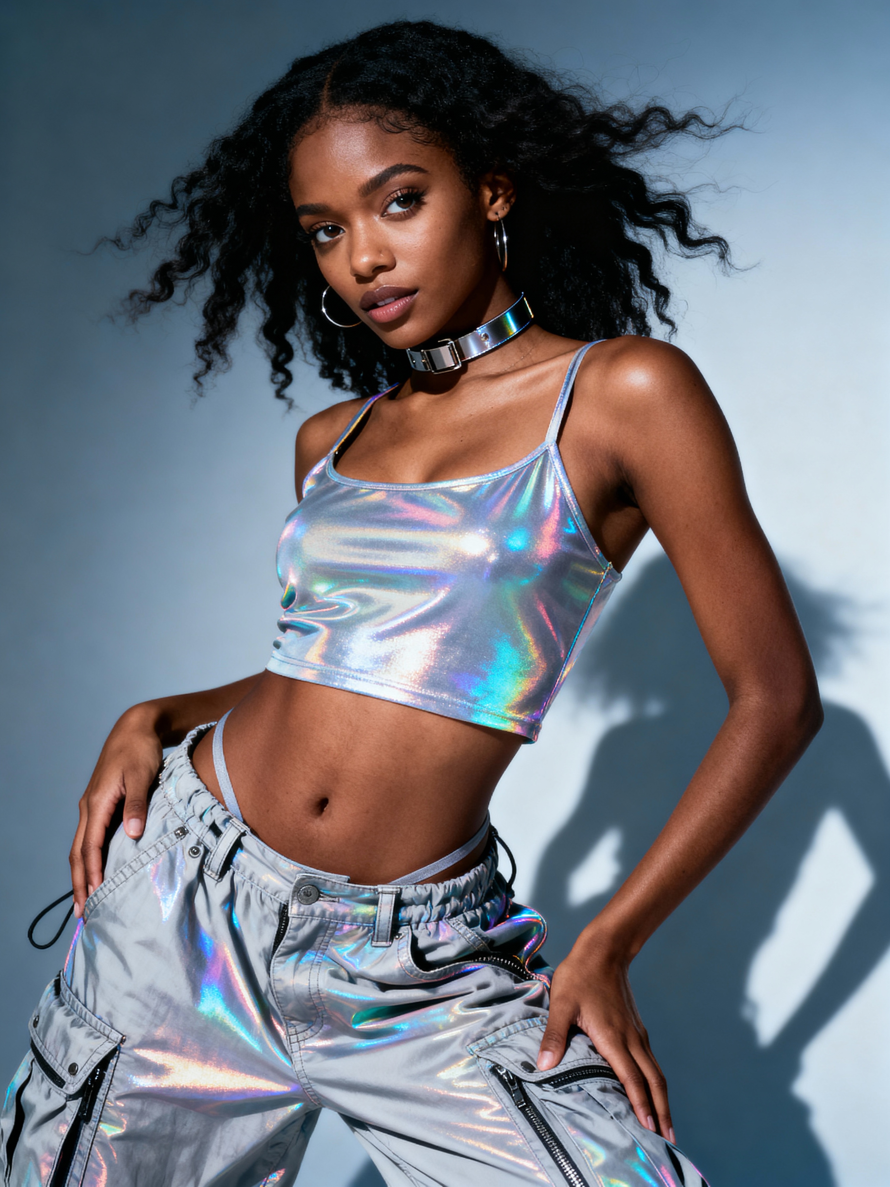 model wearing Y2K aesthetic, 2000s fashion, aughts style, noughties style, grunge or 2000s style, oversized washed out style, baggy pants, low rise pants or cargo pants, crop top, Choker, metallic glossy, iridescent fabrics, posing for photo