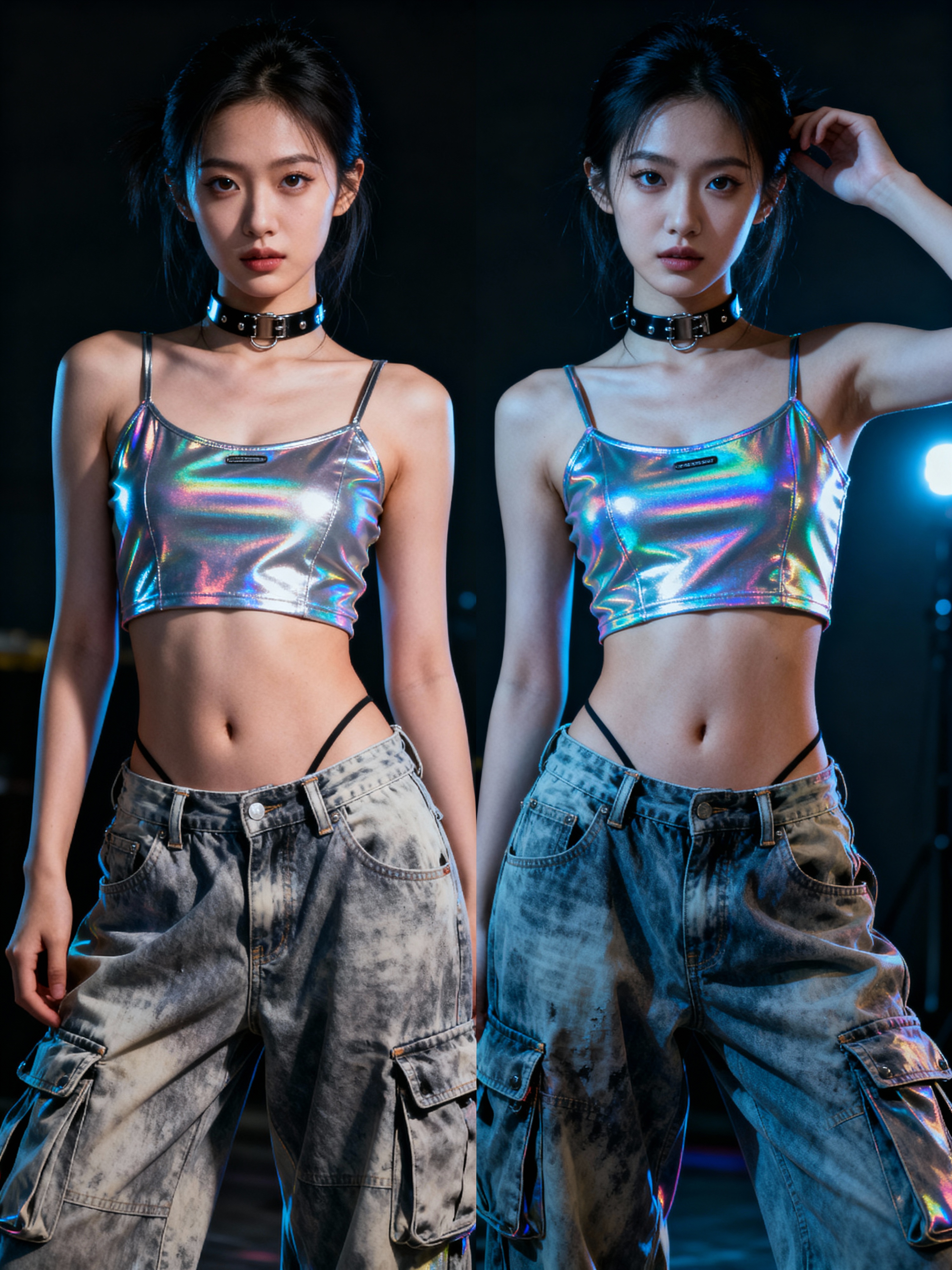 model wearing Y2K aesthetic, 2000s fashion, aughts style, noughties style, grunge or 2000s style, oversized washed out style, baggy pants, low rise pants or cargo pants, crop top, Choker, metallic glossy, iridescent fabrics, posing for photo