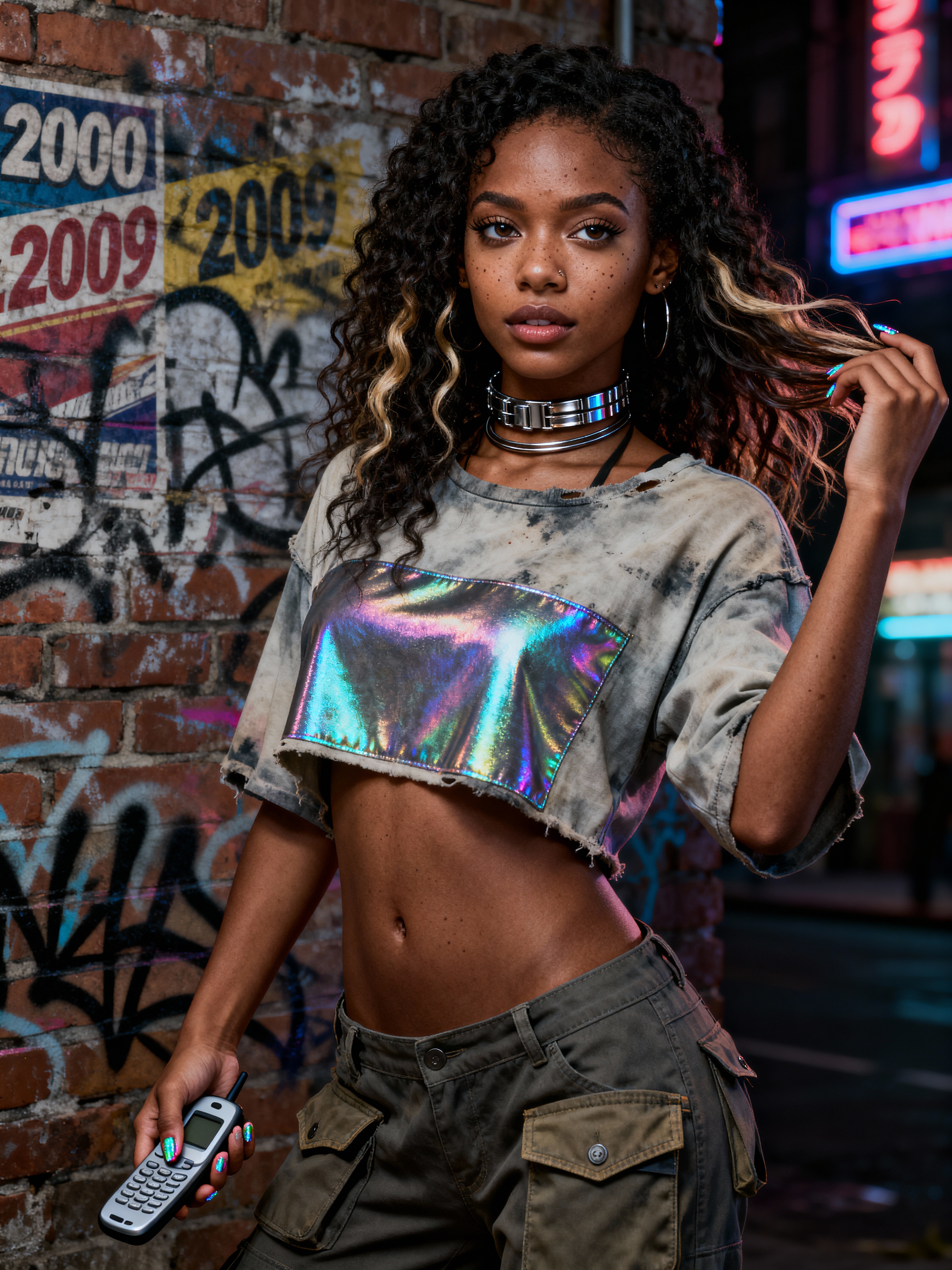 model wearing Y2K aesthetic, 2000s fashion, aughts style, noughties style, grunge or 2000s style, oversized washed out style, baggy pants, low rise pants or cargo pants, crop top, Choker, metallic glossy, iridescent fabrics, posing for photo