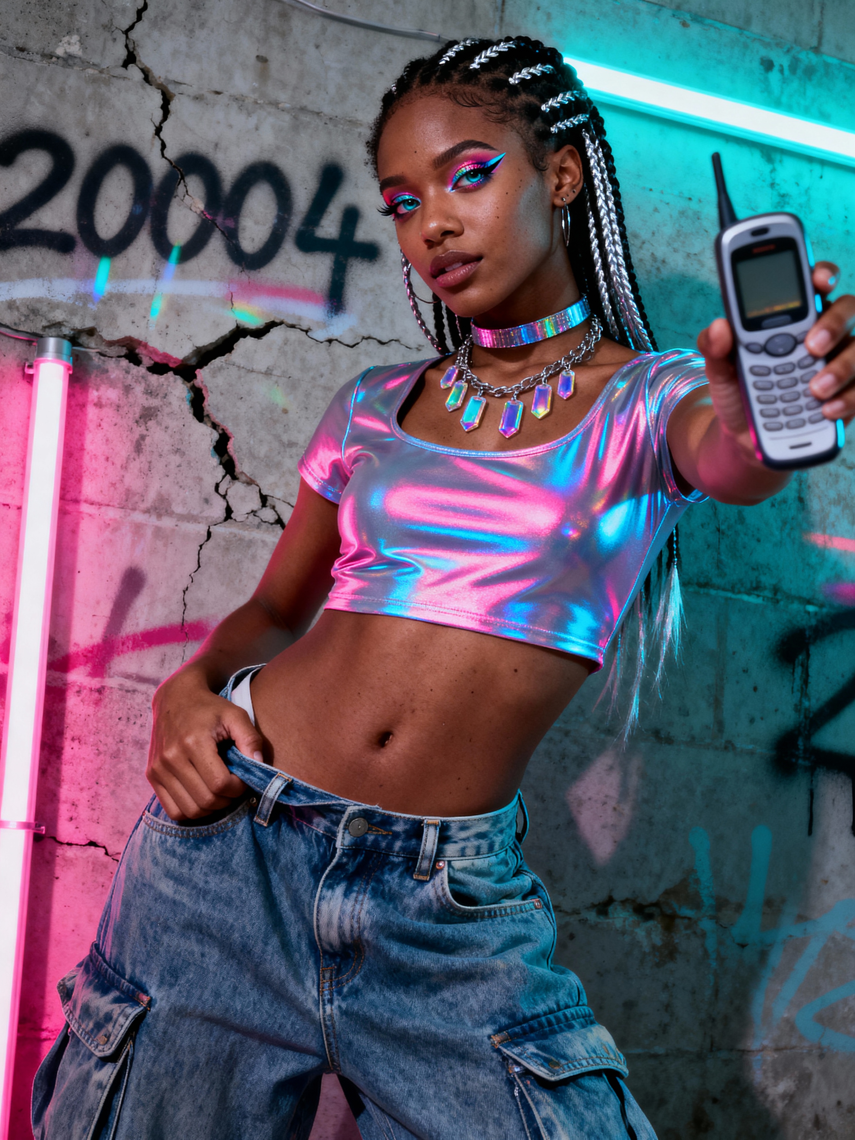 model wearing Y2K aesthetic, 2000s fashion, aughts style, noughties style, grunge or 2000s style, oversized washed out style, baggy pants, low rise pants or cargo pants, crop top, Choker, metallic glossy, iridescent fabrics, posing for photo