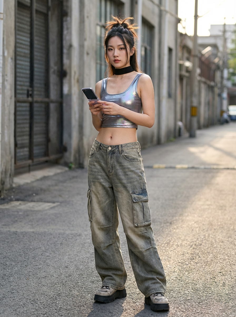 model wearing Y2K aesthetic, 2000s fashion, aughts style, noughties style, grunge or 2000s style, oversized washed out style, baggy pants, low rise pants or cargo pants, crop top, Choker, metallic glossy, iridescent fabrics, posing for photo