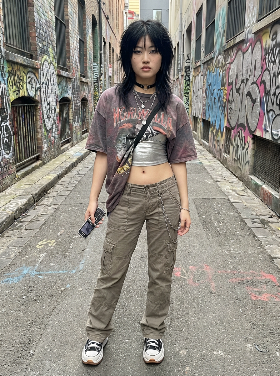model wearing Y2K aesthetic, 2000s fashion, aughts style, noughties style, grunge or 2000s style, oversized washed out style, baggy pants, low rise pants or cargo pants, crop top, Choker, metallic glossy, iridescent fabrics, posing for photo