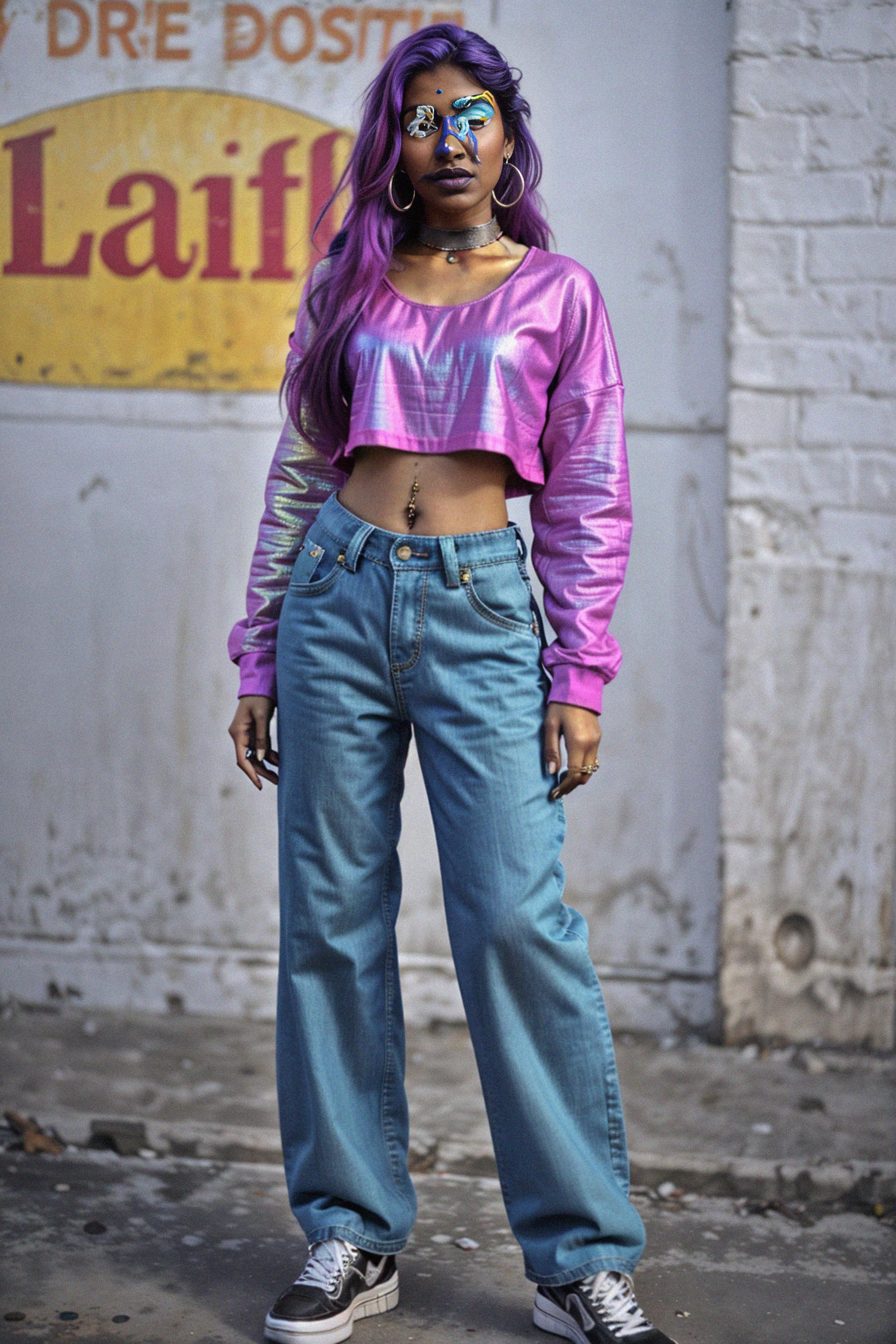 model wearing Y2K aesthetic, 2000s fashion, aughts style, noughties style, grunge or 2000s style, oversized washed out style, baggy pants, low rise pants or cargo pants, crop top, Choker, Metallic, iridescent fabrics, posing for photo